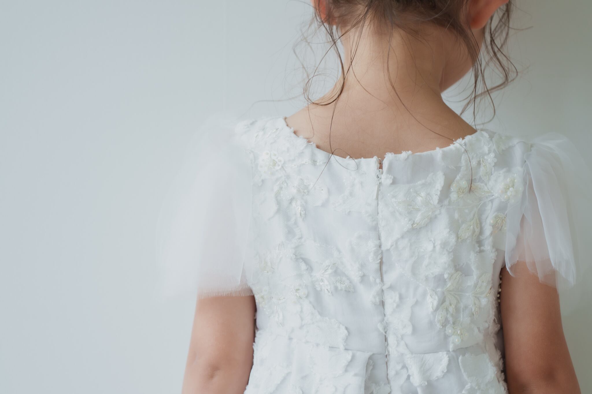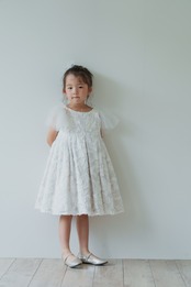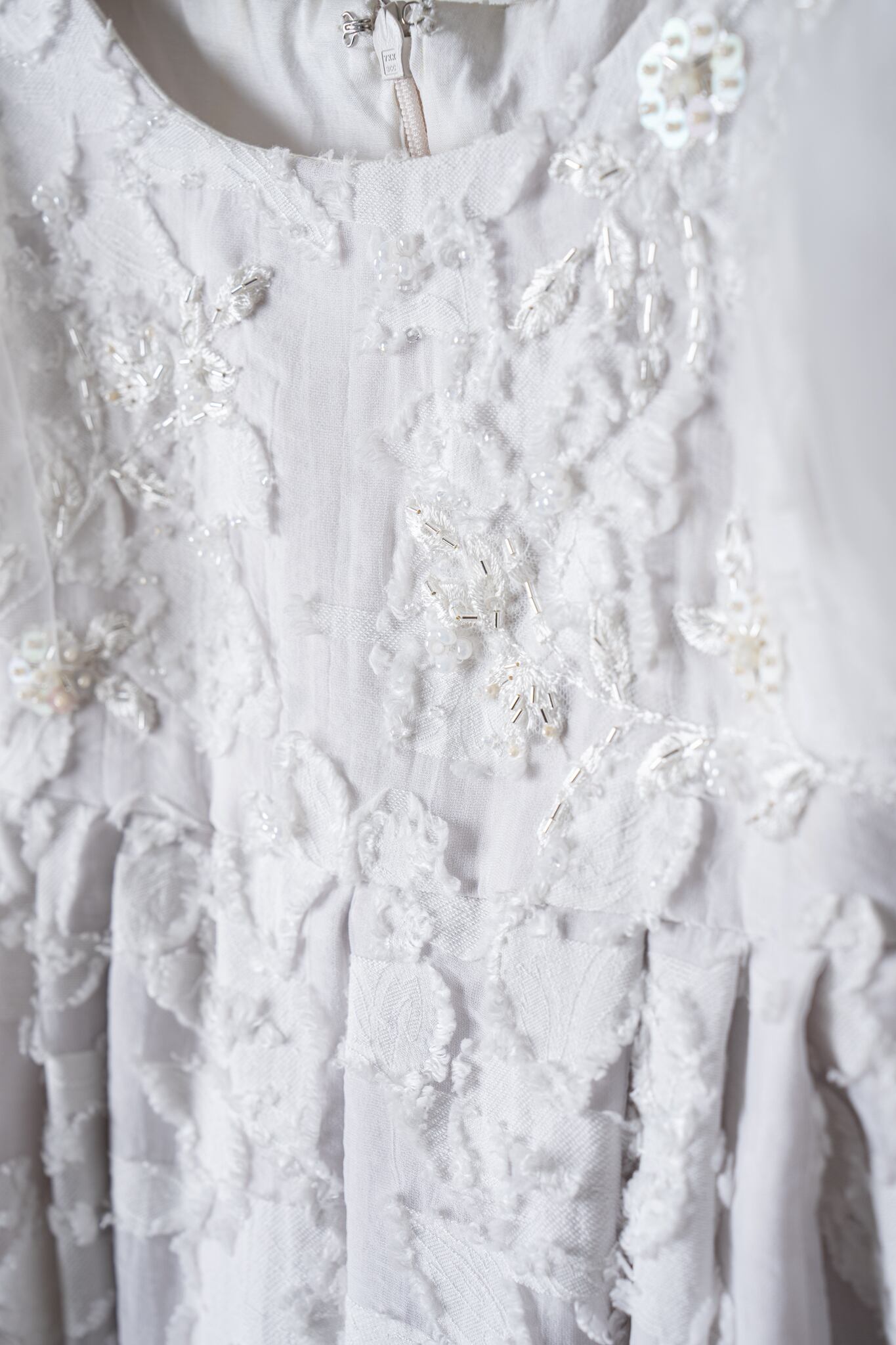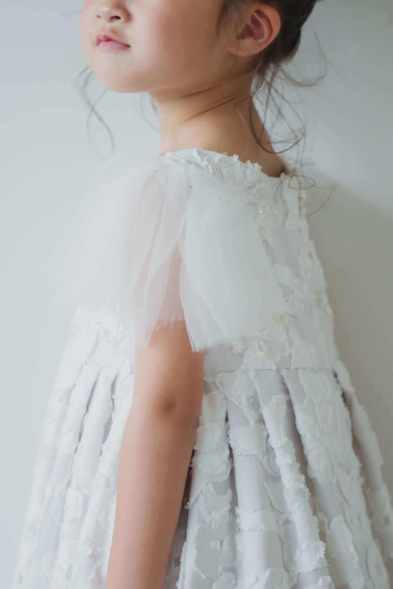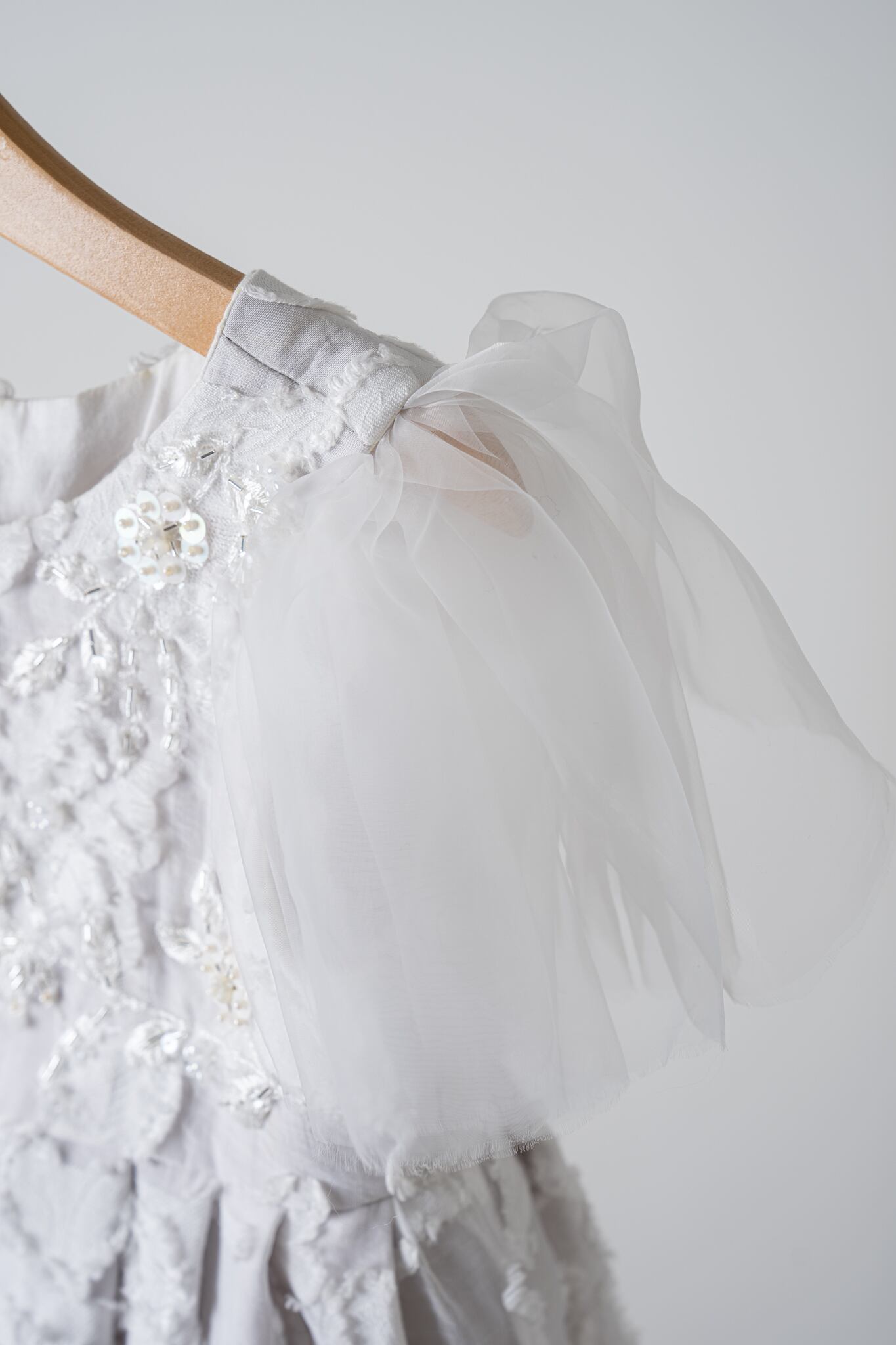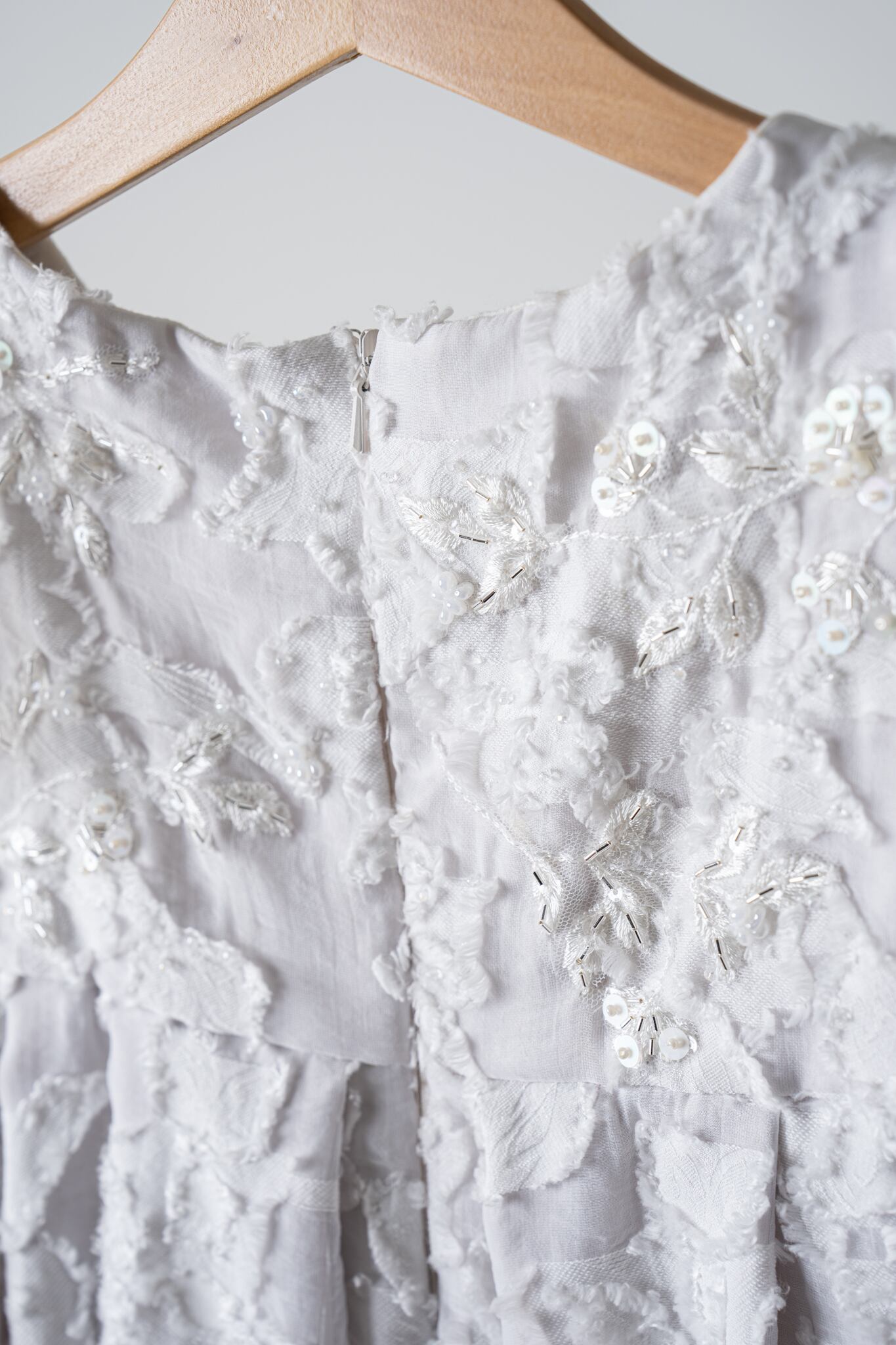 シルバーや乳白色、透明のビーズを散らして縫い付けました。とろけそうな柔らかいお袖も特徴です。