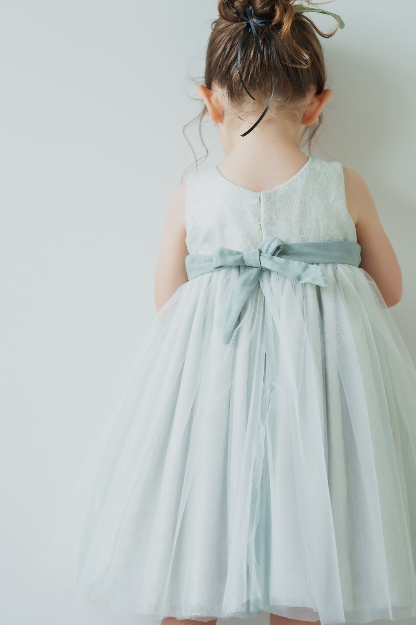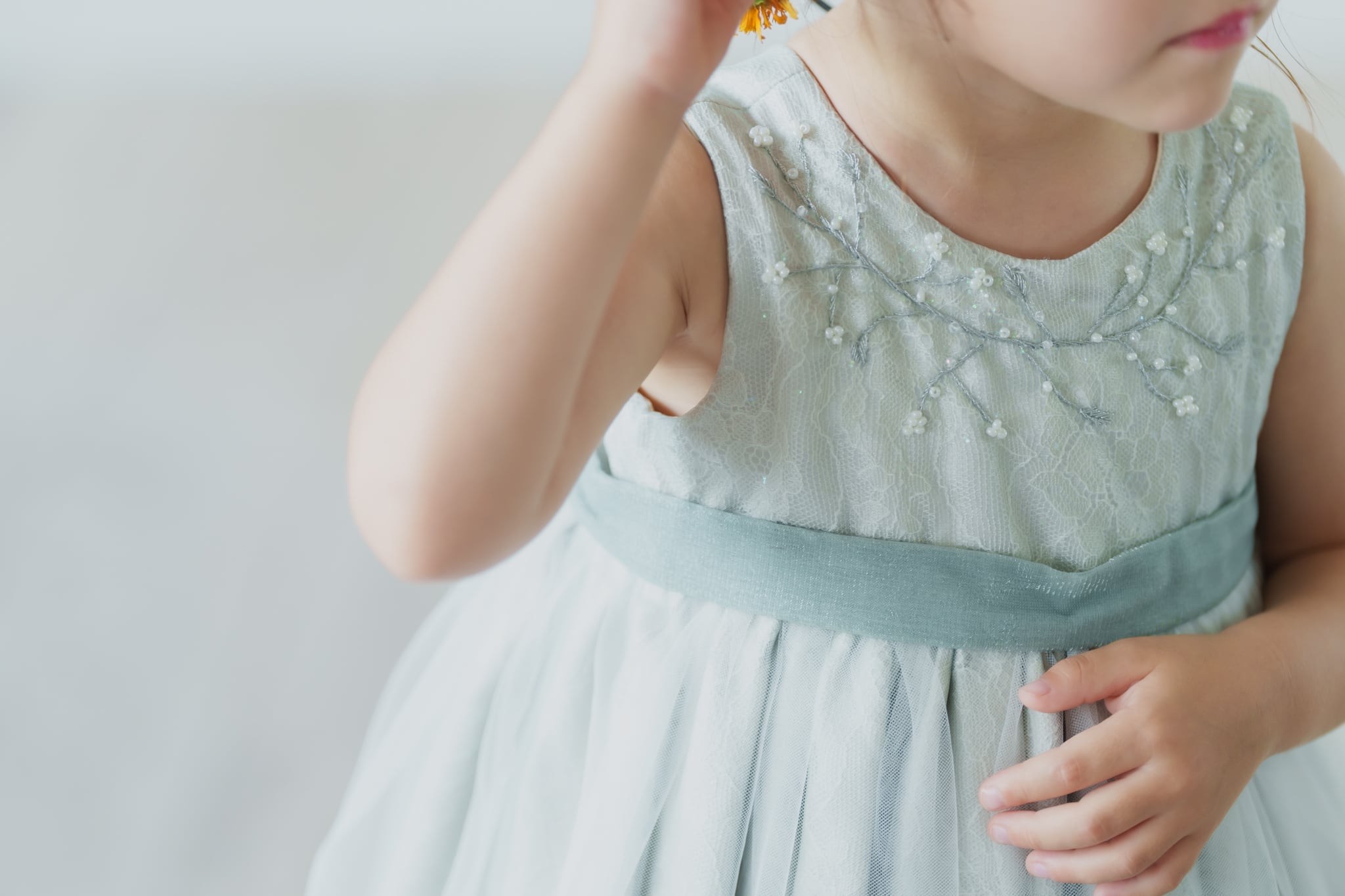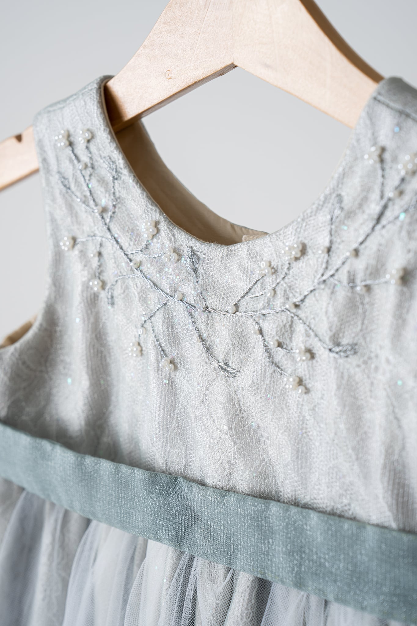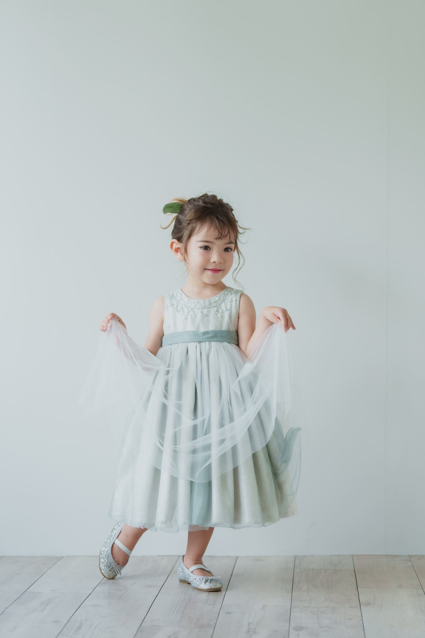 リプテュと同素材でおつくりしています。グリーンの透明感と胸元の繊細な手刺繍がポイント。リプテュよりボリュームが出る、ギャザースカートのつくりになっています。(リプテュはタックのスカート)