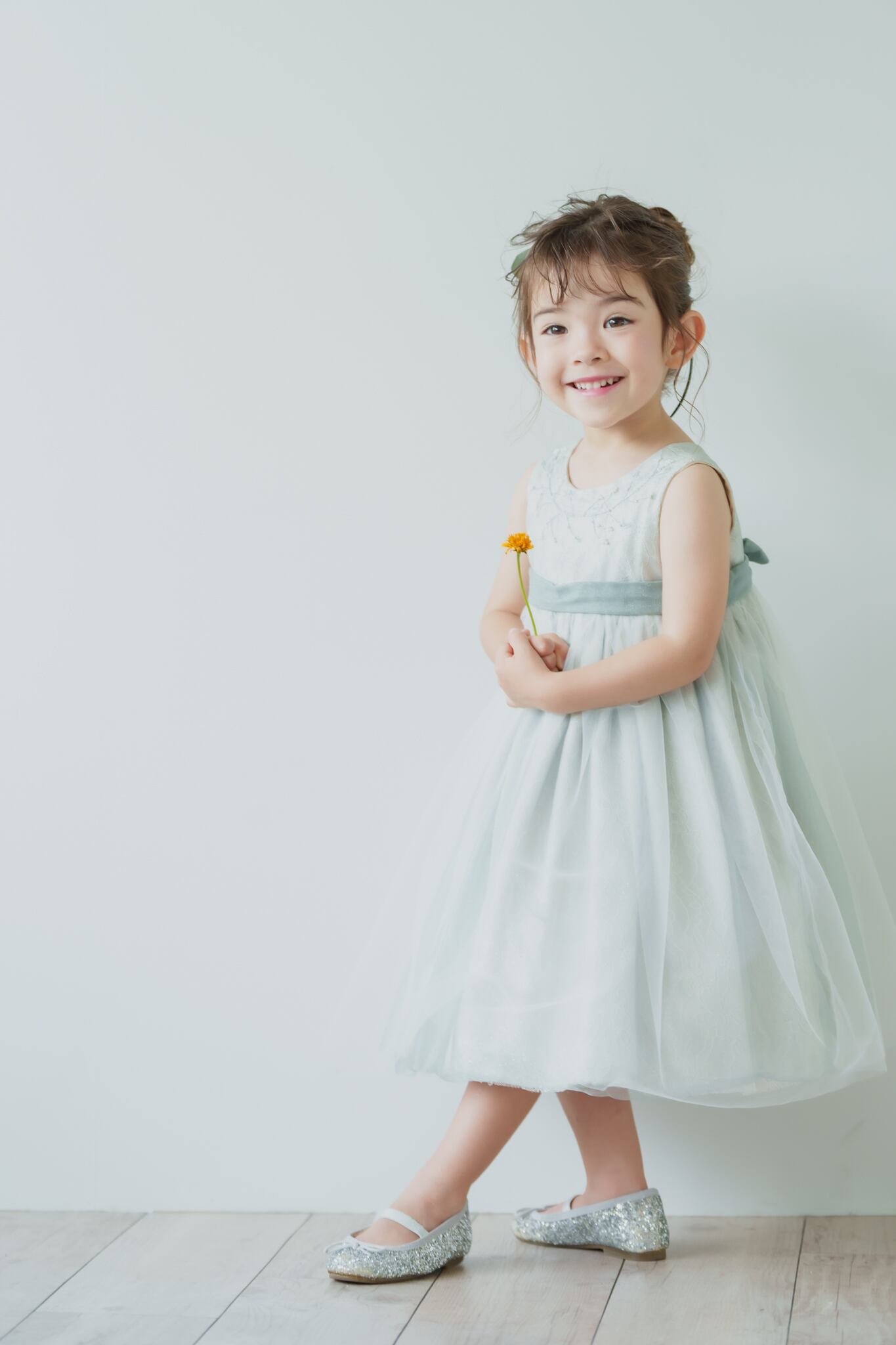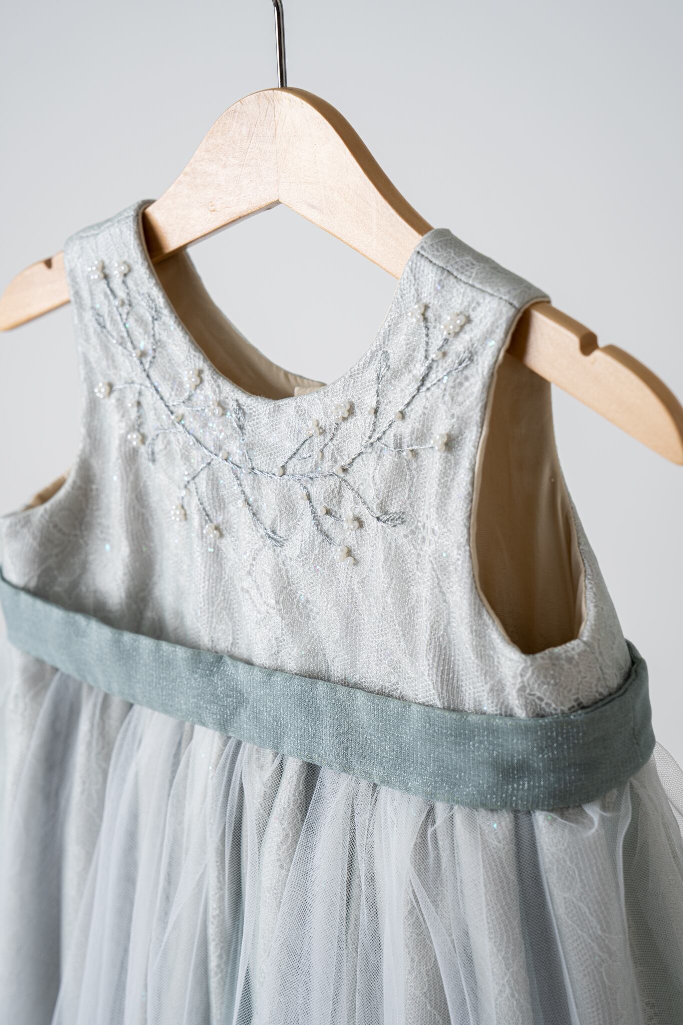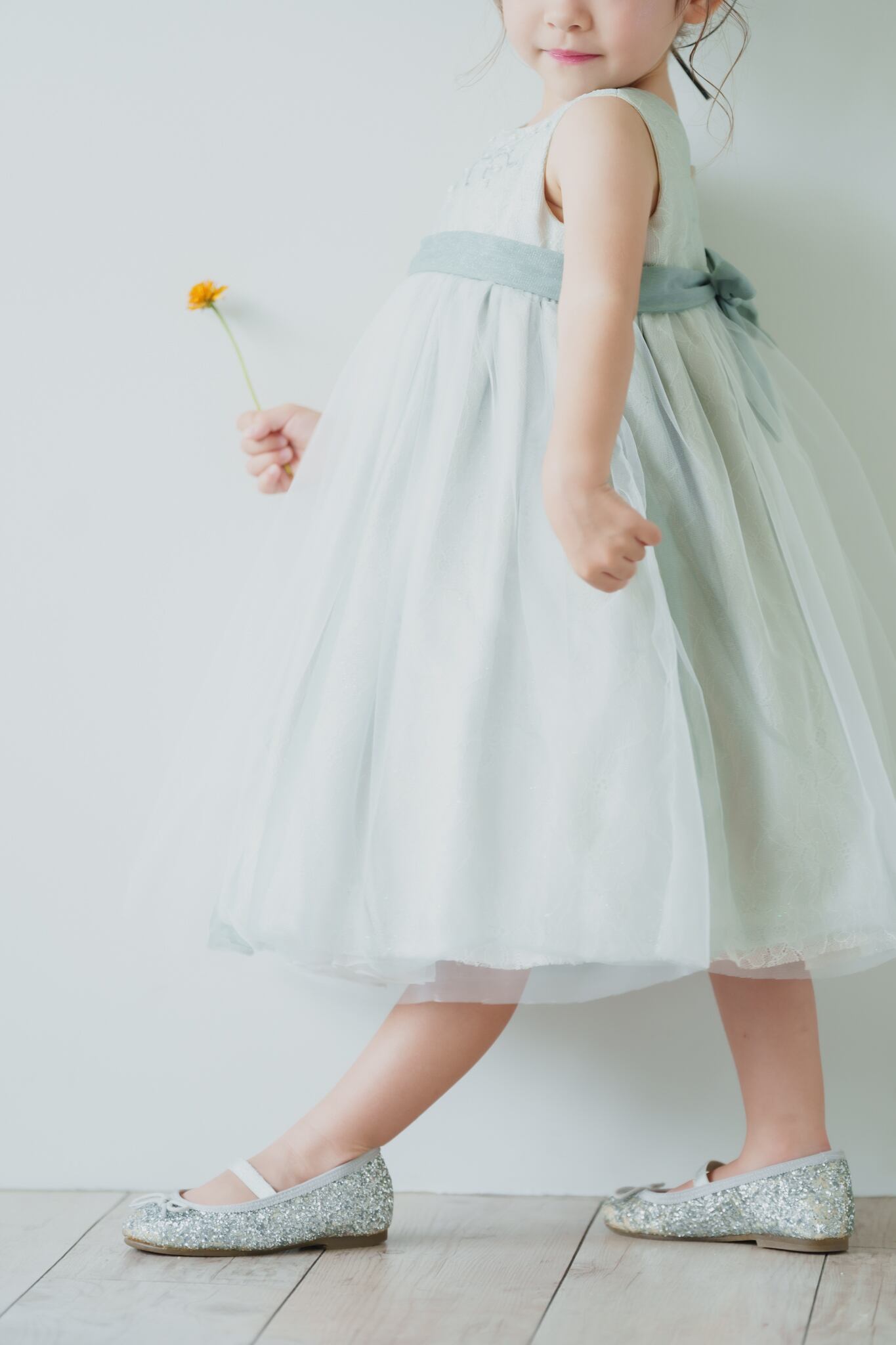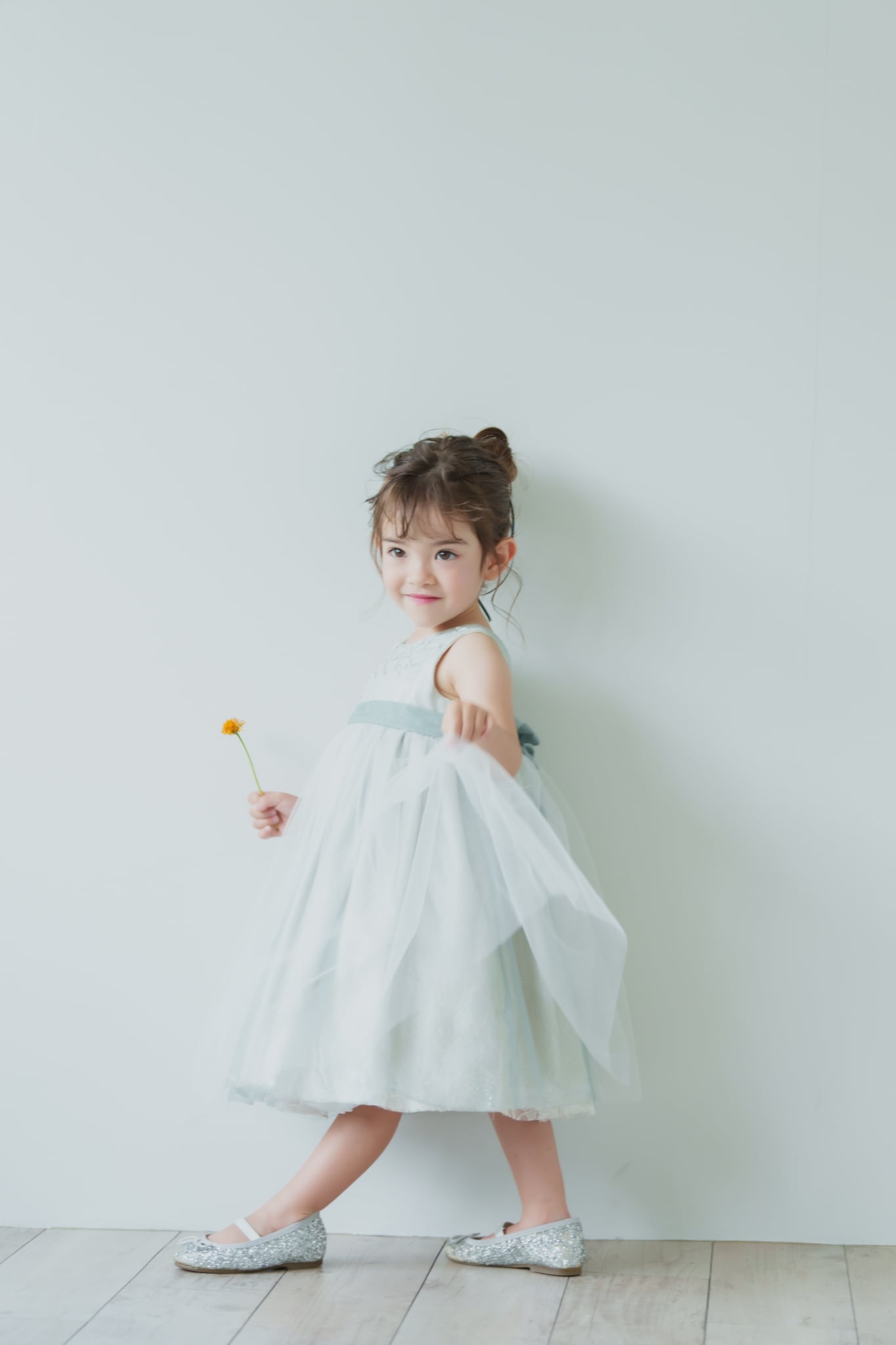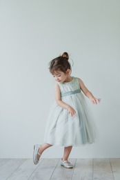 リプテュと同素材でおつくりしています。グリーンの透明感と胸元の繊細な手刺繍がポイント。リプテュよりボリュームが出る、ギャザースカートのつくりになっています。(リプテュはタックのスカート)