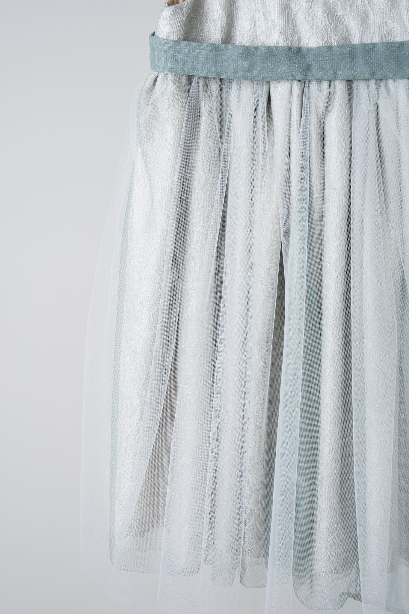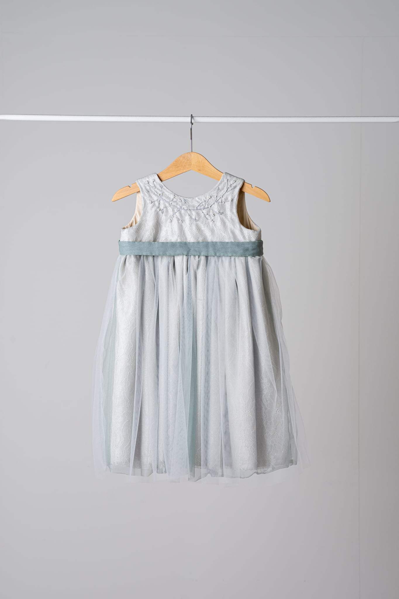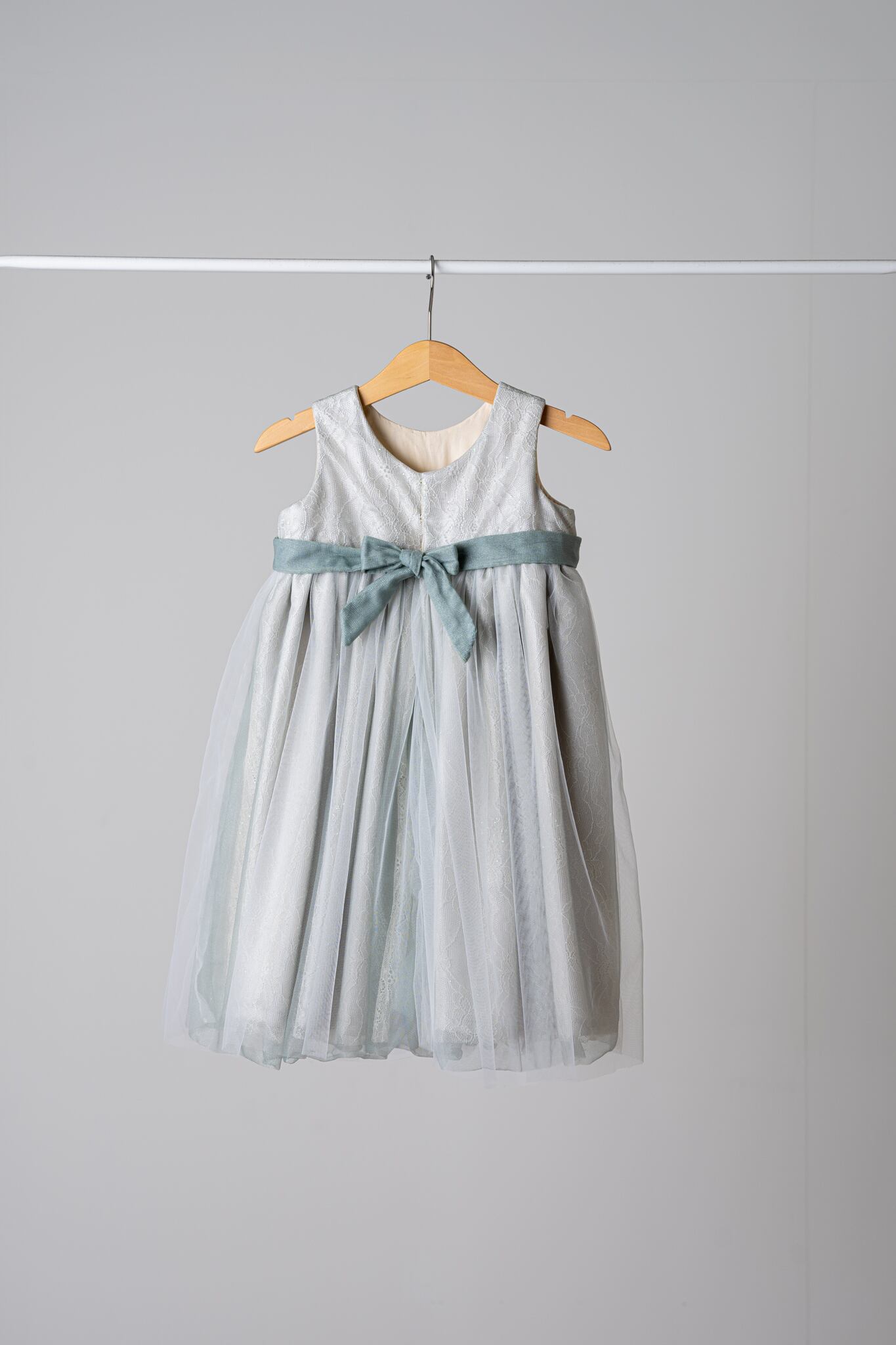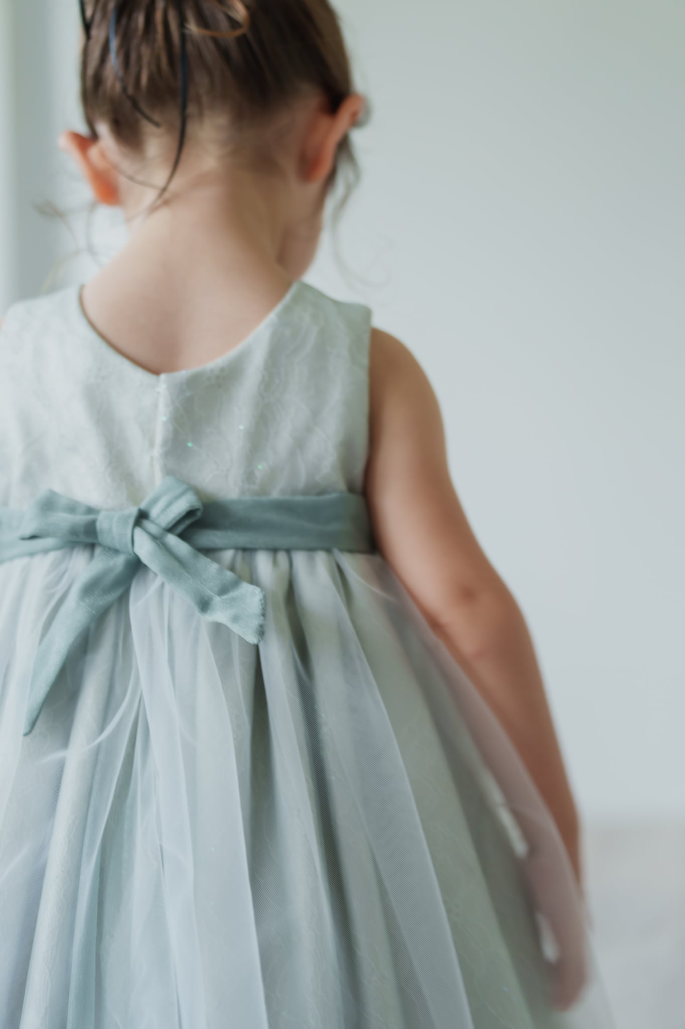 リプテュと同素材でおつくりしています。グリーンの透明感と胸元の繊細な手刺繍がポイント。リプテュよりボリュームが出る、ギャザースカートのつくりになっています。(リプテュはタックのスカート)