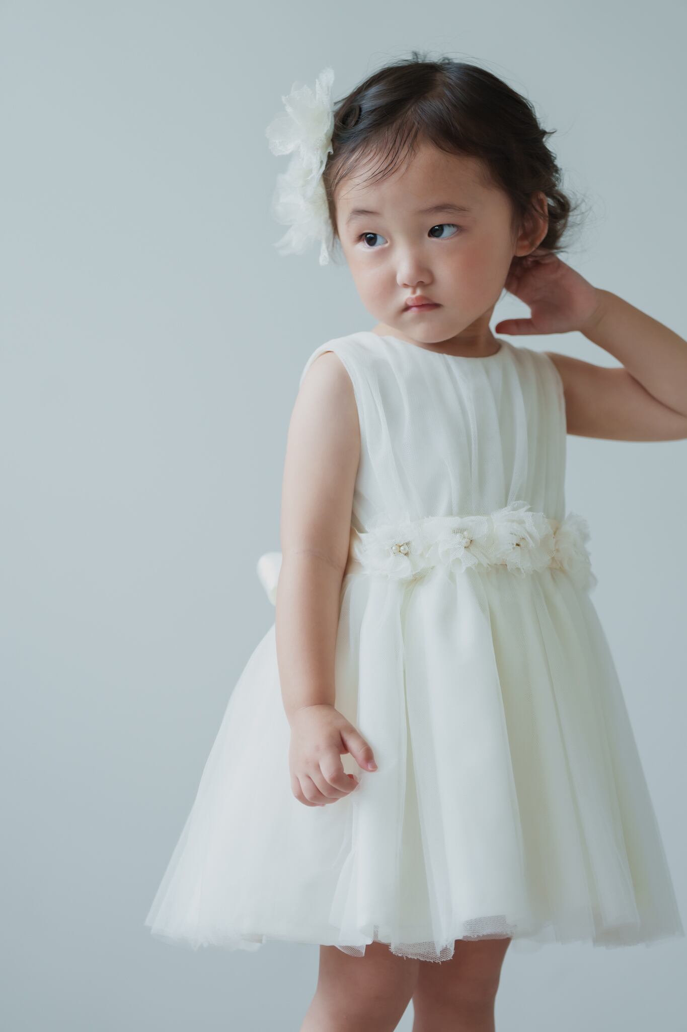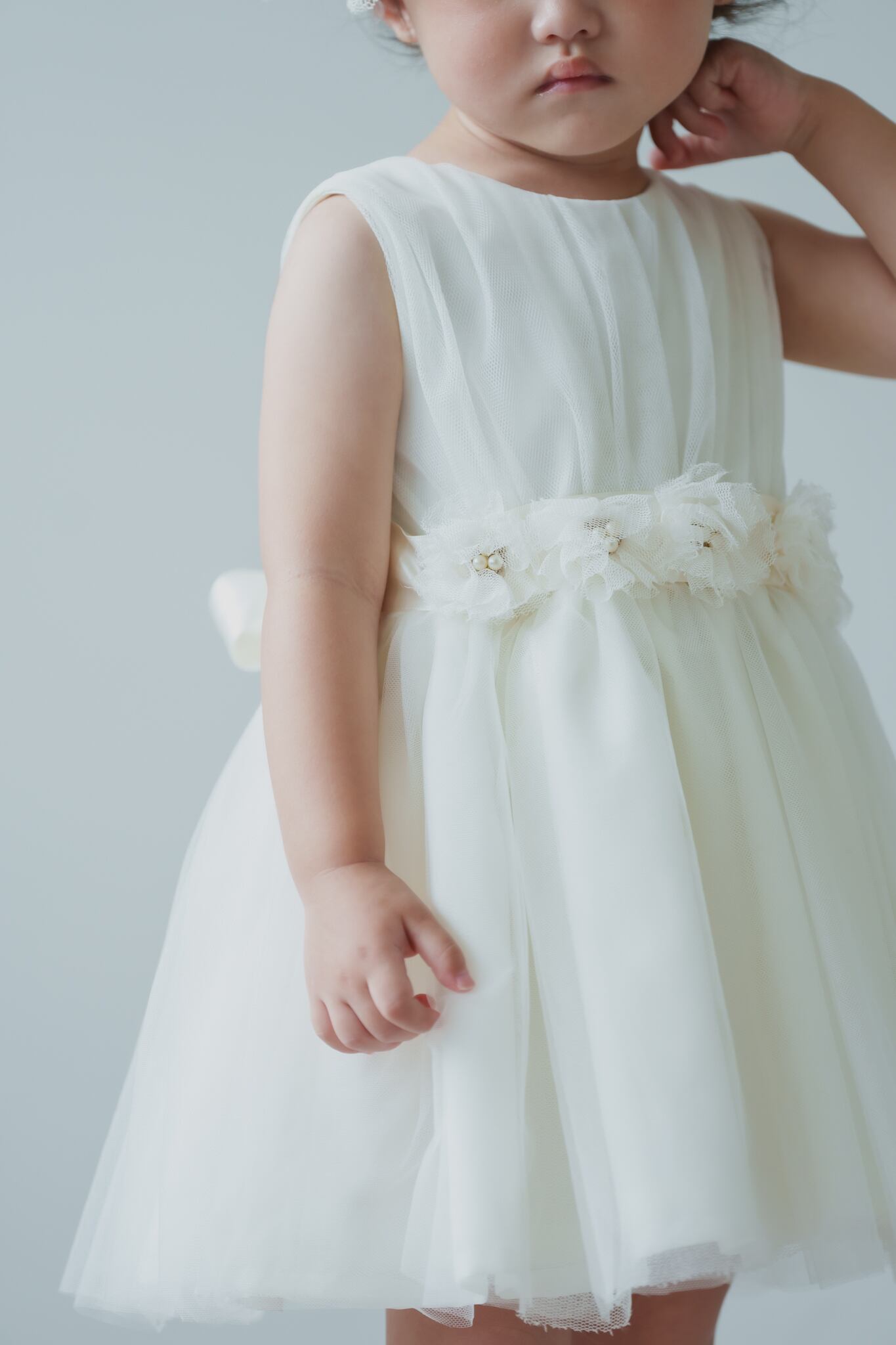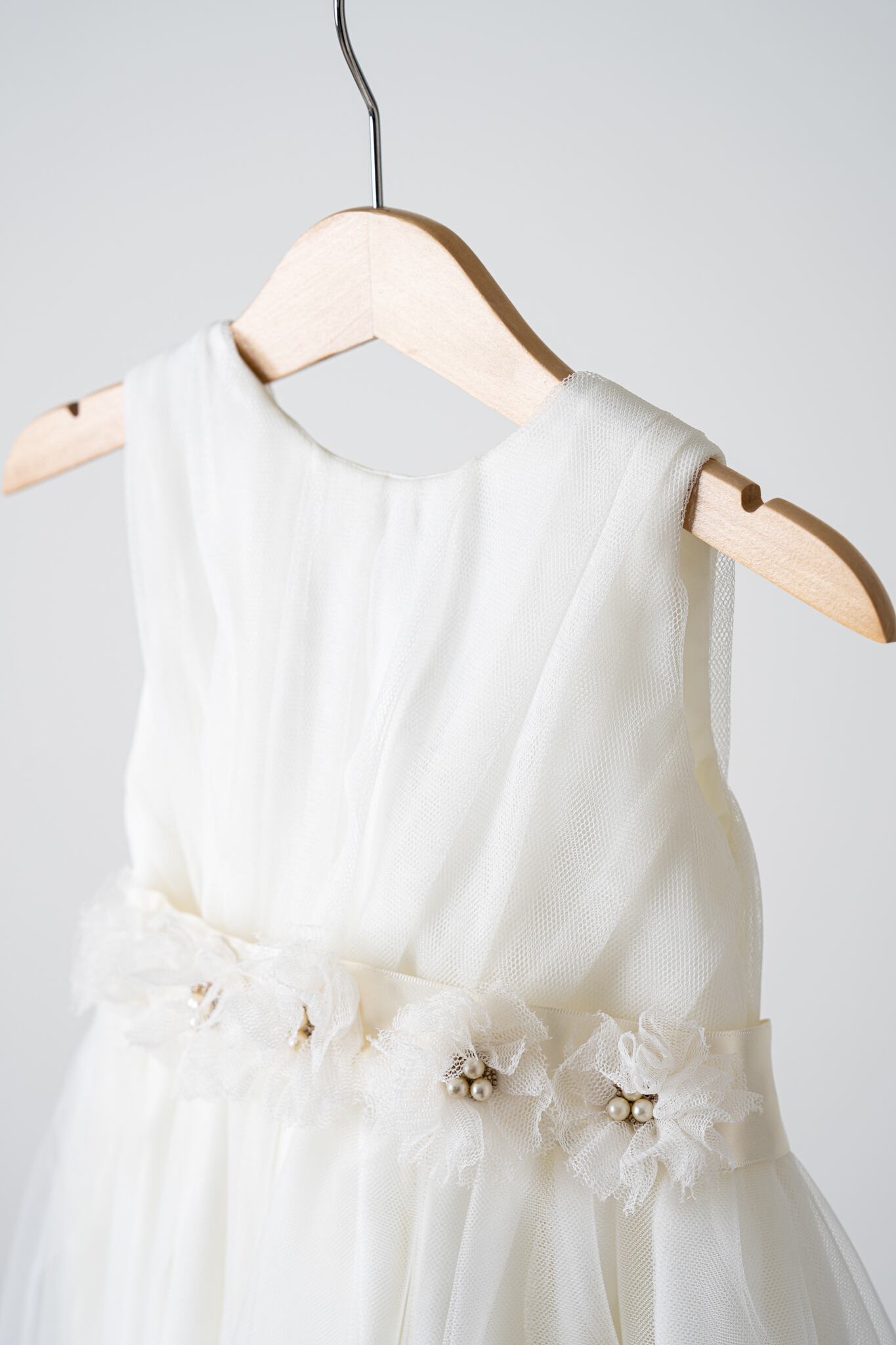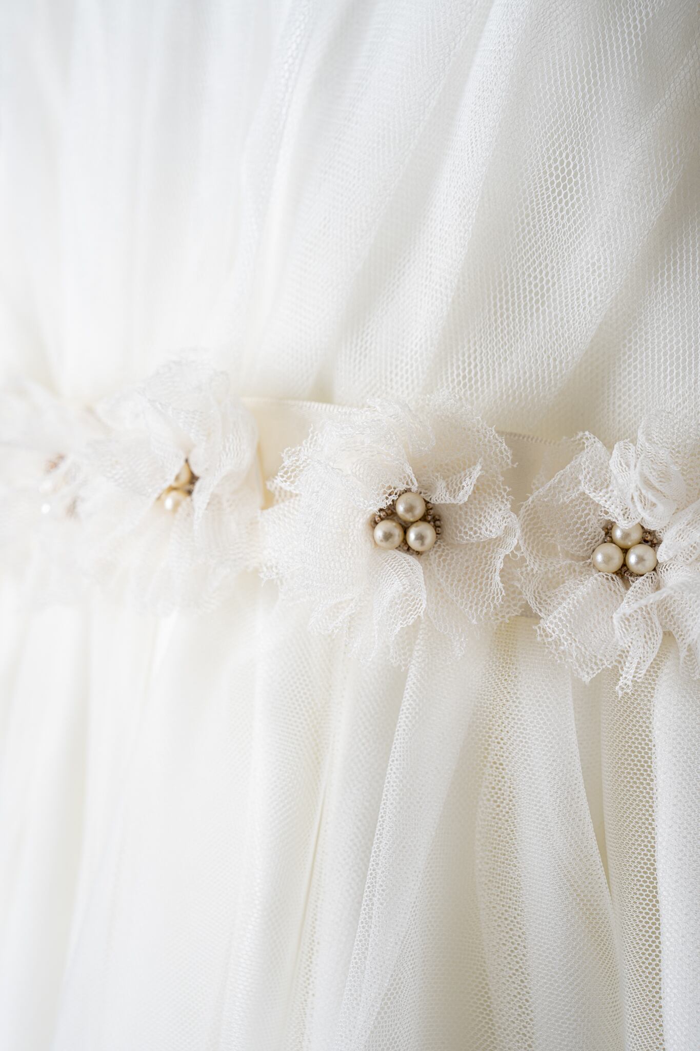 サッシュベルトのコサージュはひとつひとつ、ドレスのチュール、ビジューとパールを使い全て手づくりで丁寧にお作りしています。