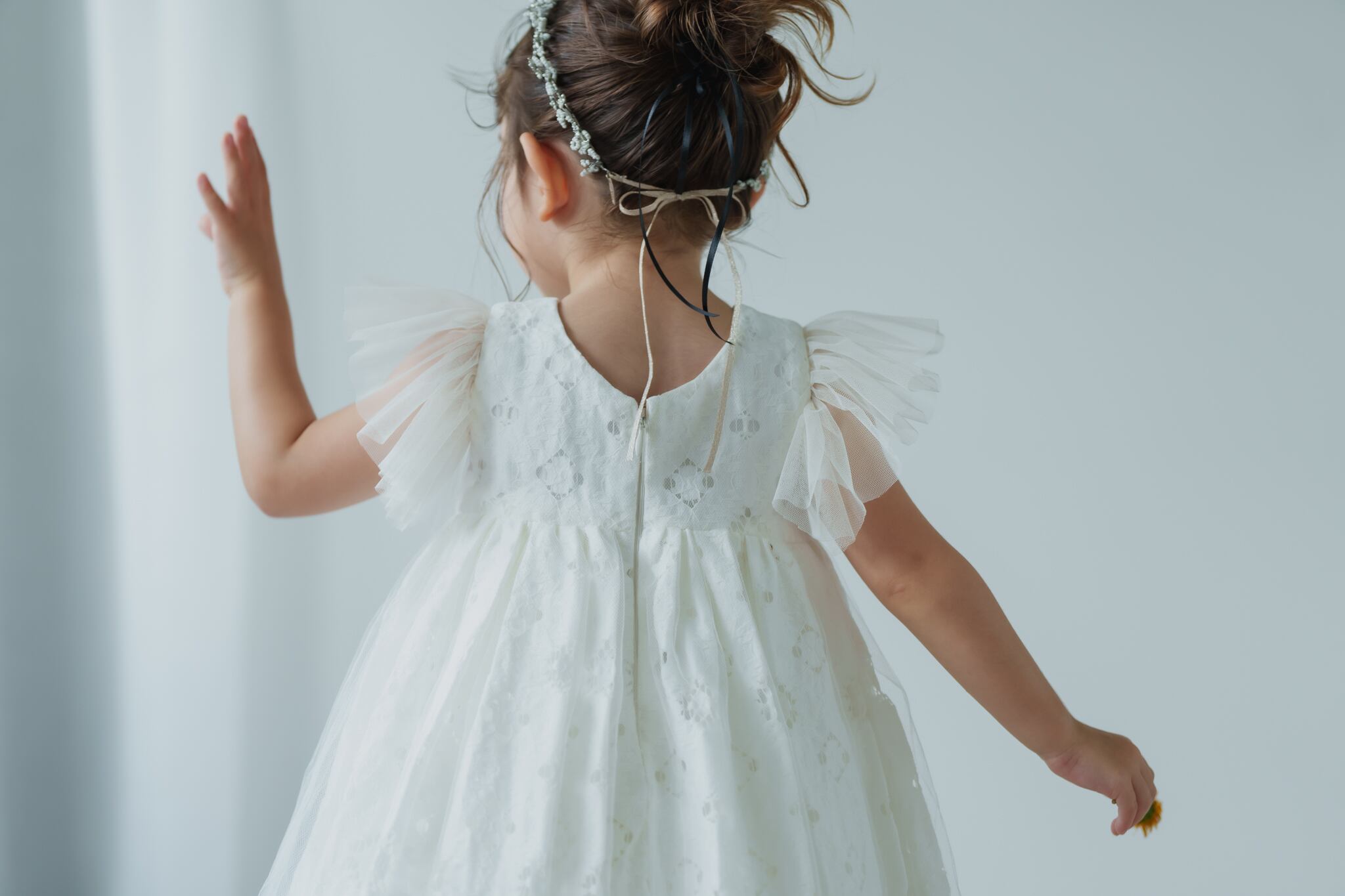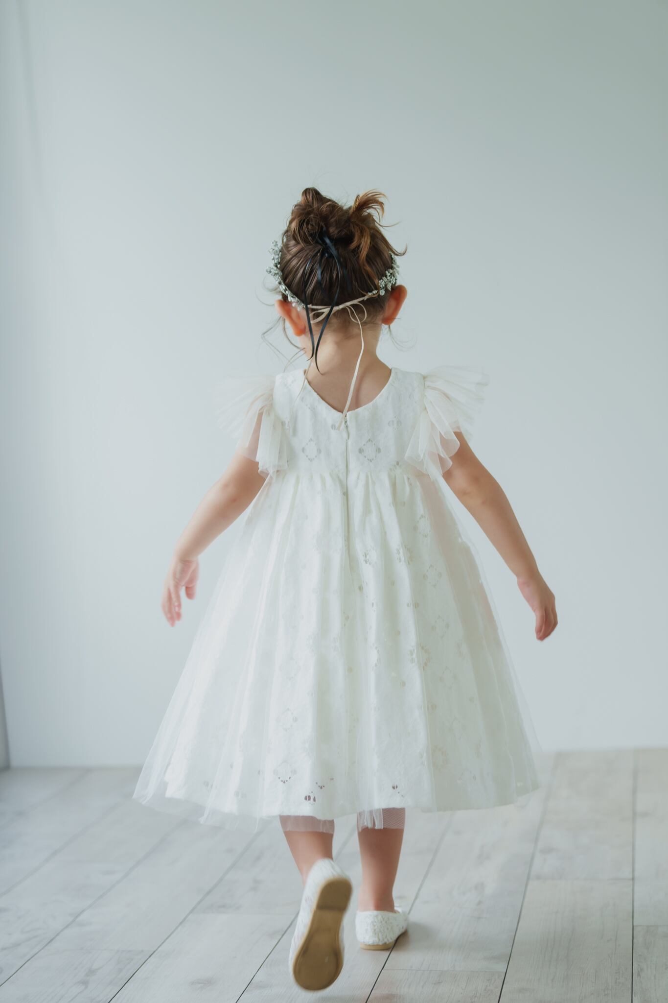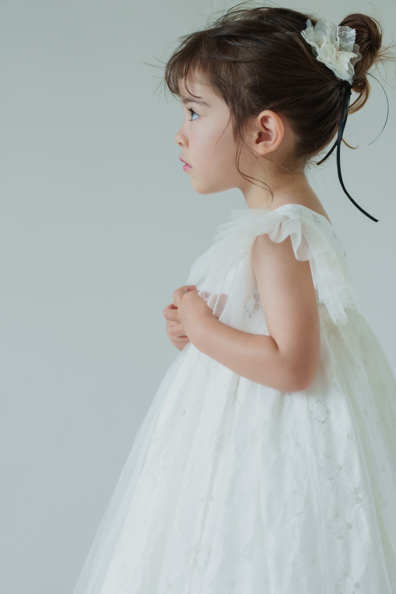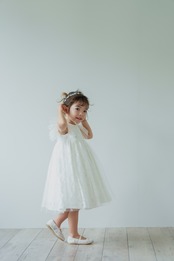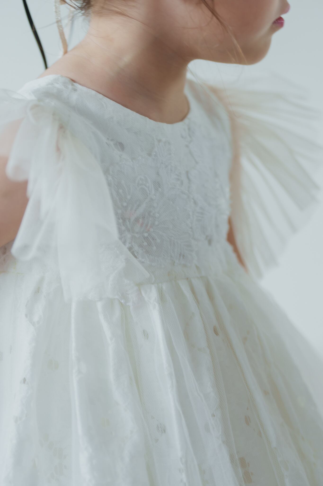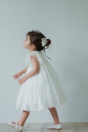 カットレースのにチュールを重ね、マルグリットと同じフランスで買い付けたヴィンテージの花刺繍を胸元につけました。姉妹でマルグリットとお揃いで着るのも可愛いです。