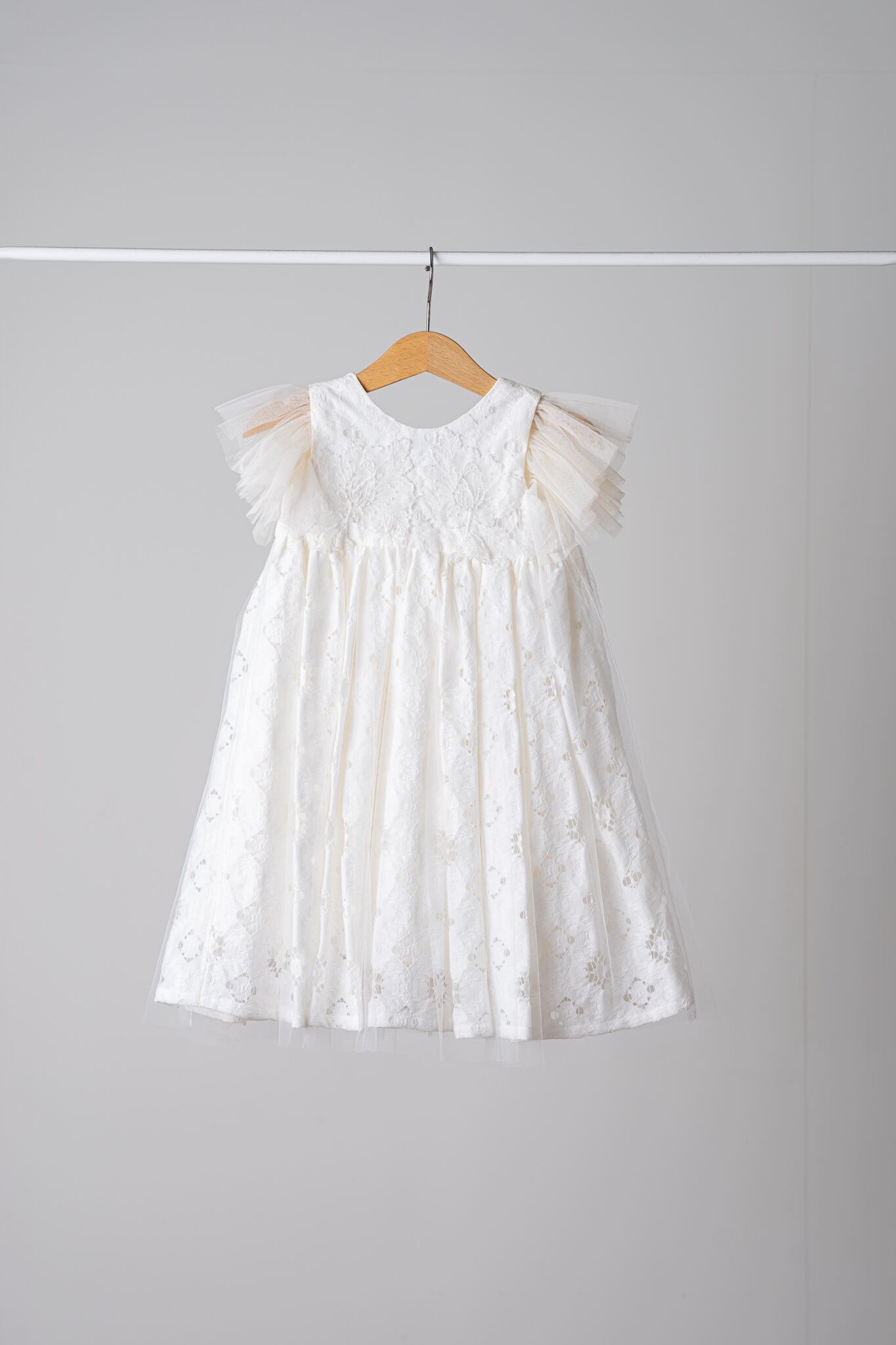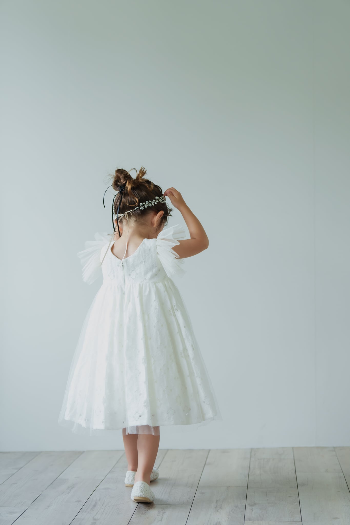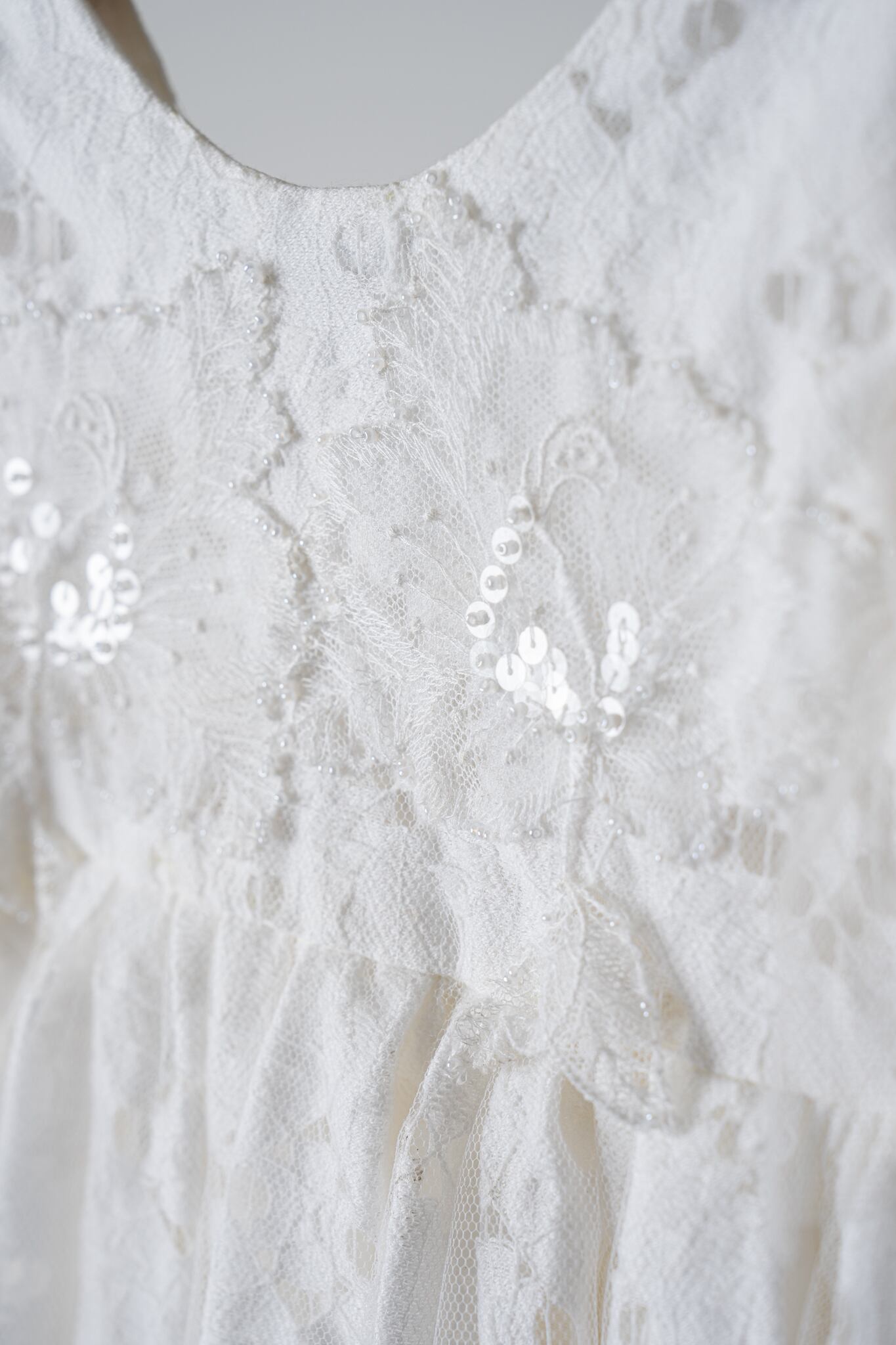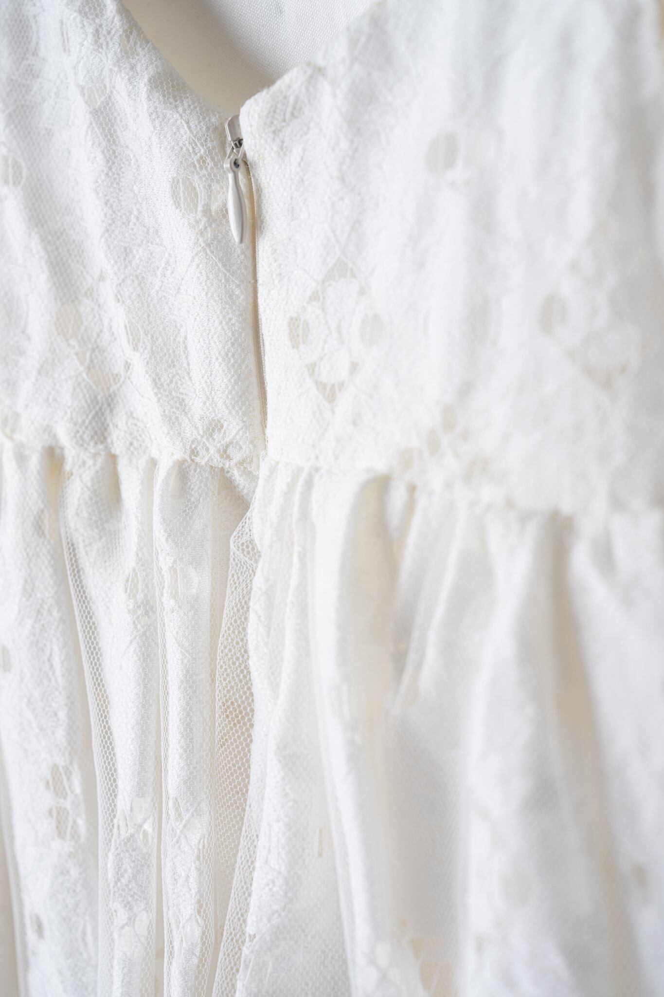 カットレースのにチュールを重ね、マルグリットと同じフランスで買い付けたヴィンテージの花刺繍を胸元につけました。姉妹でマルグリットとお揃いで着るのも可愛いです。