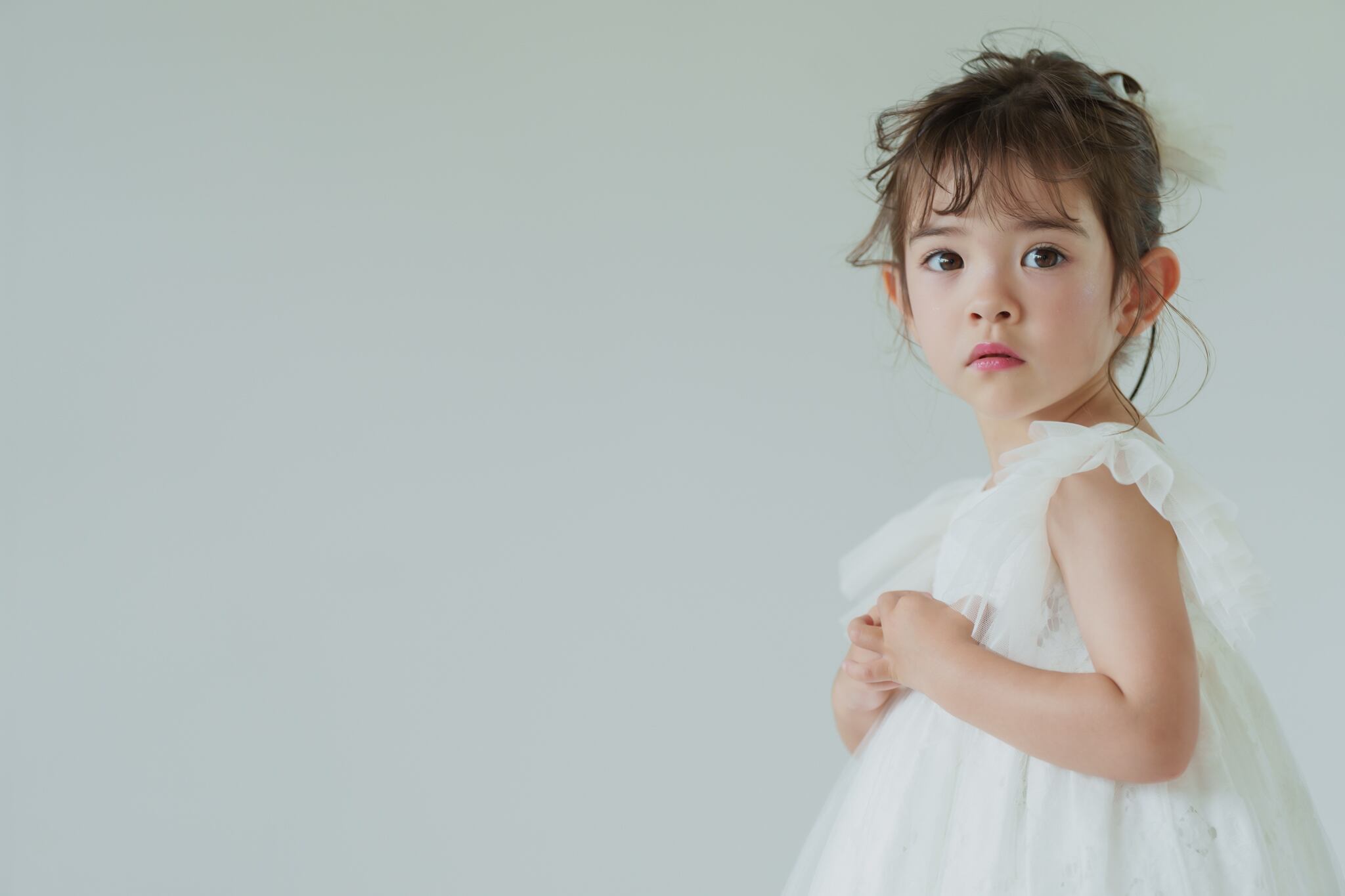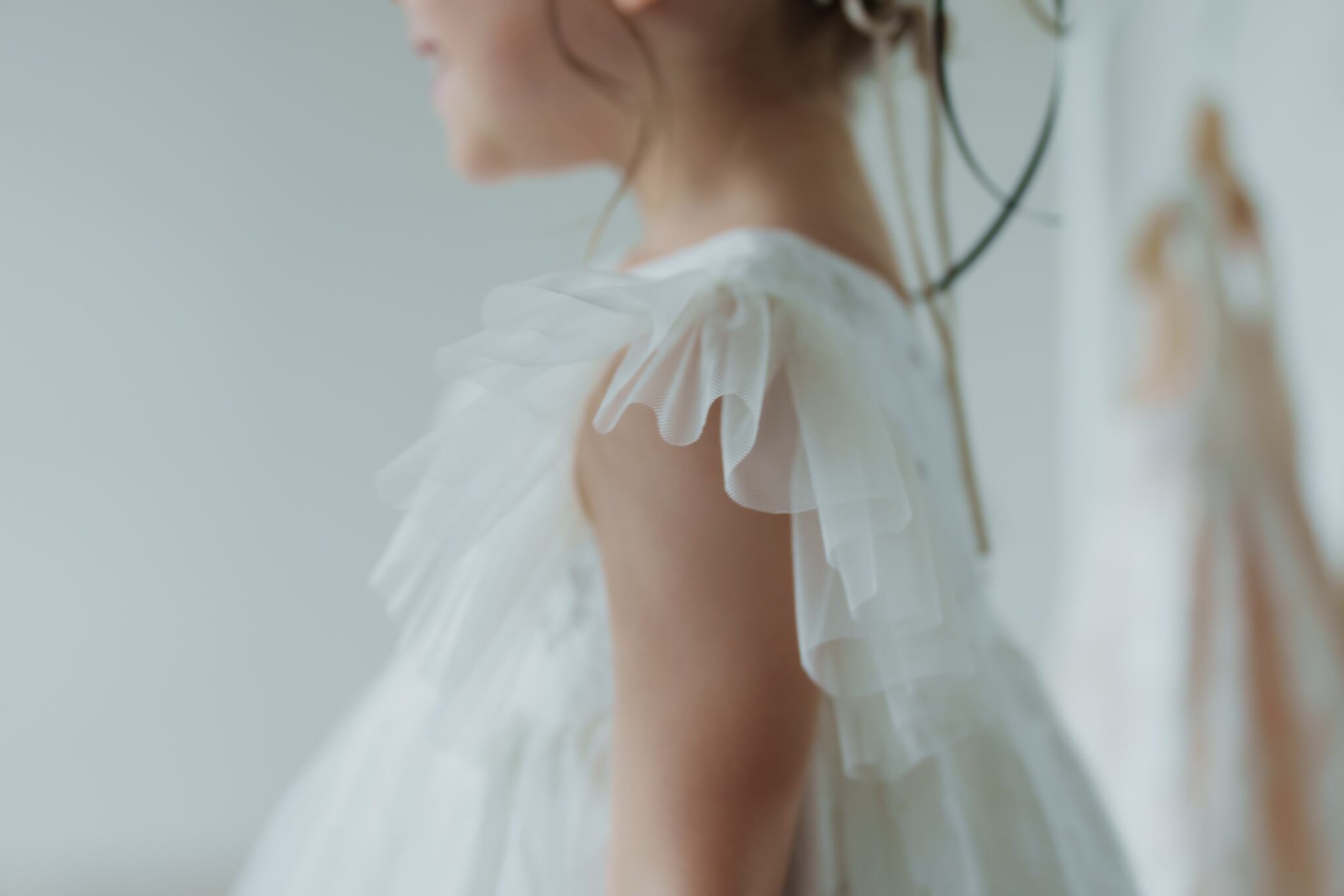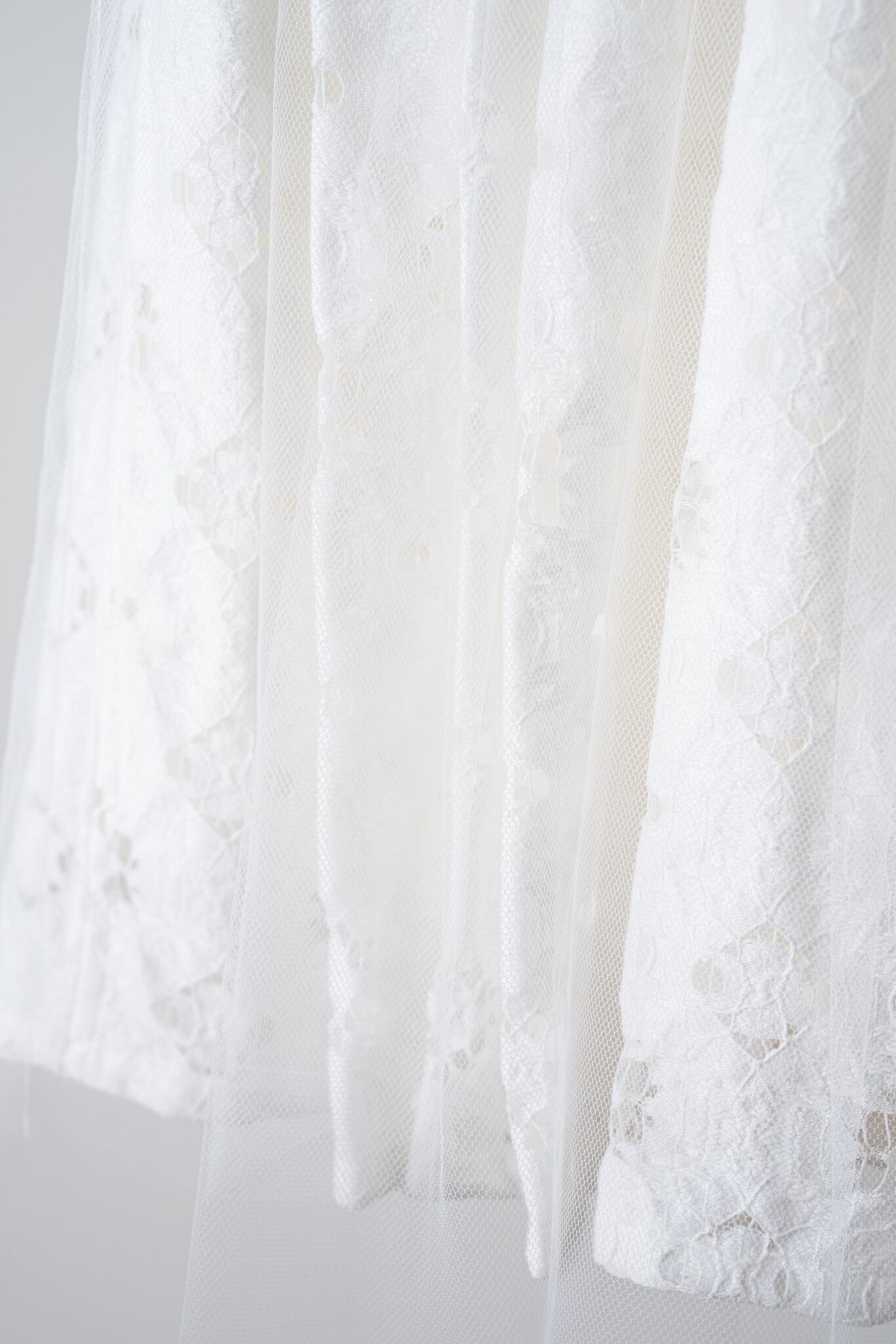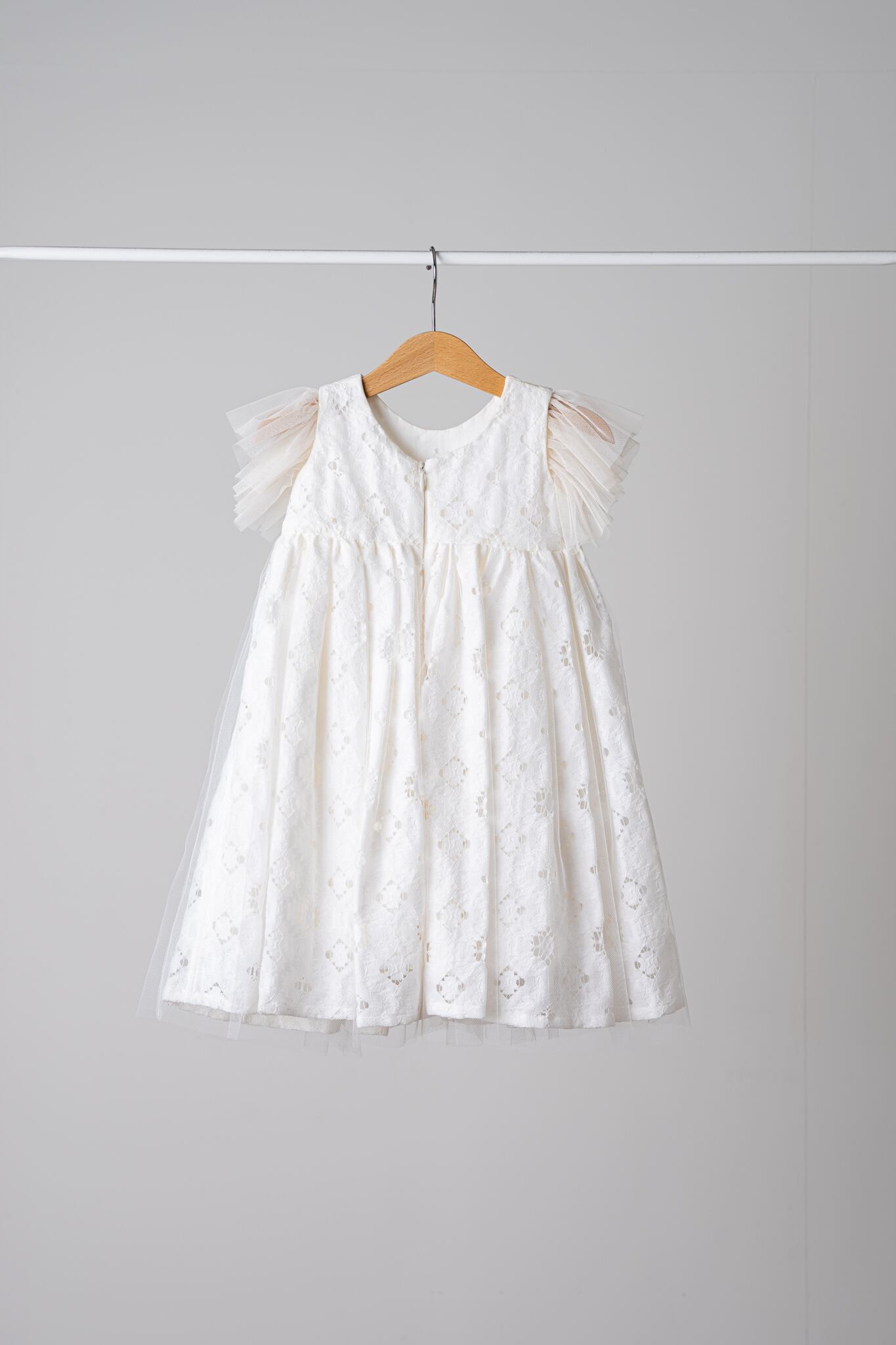 カットレースのにチュールを重ね、マルグリットと同じフランスで買い付けたヴィンテージの花刺繍を胸元につけました。姉妹でマルグリットとお揃いで着るのも可愛いです。
