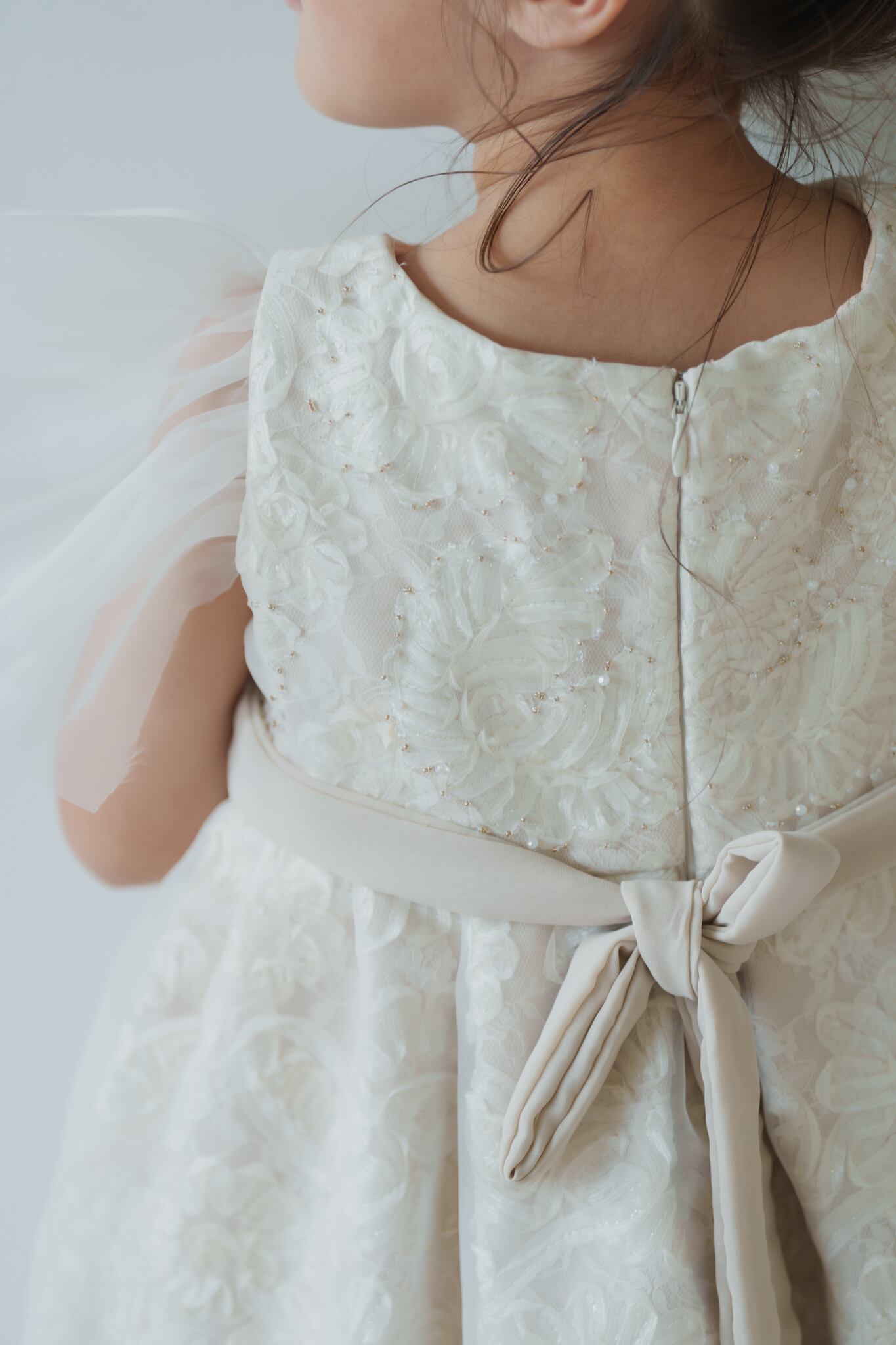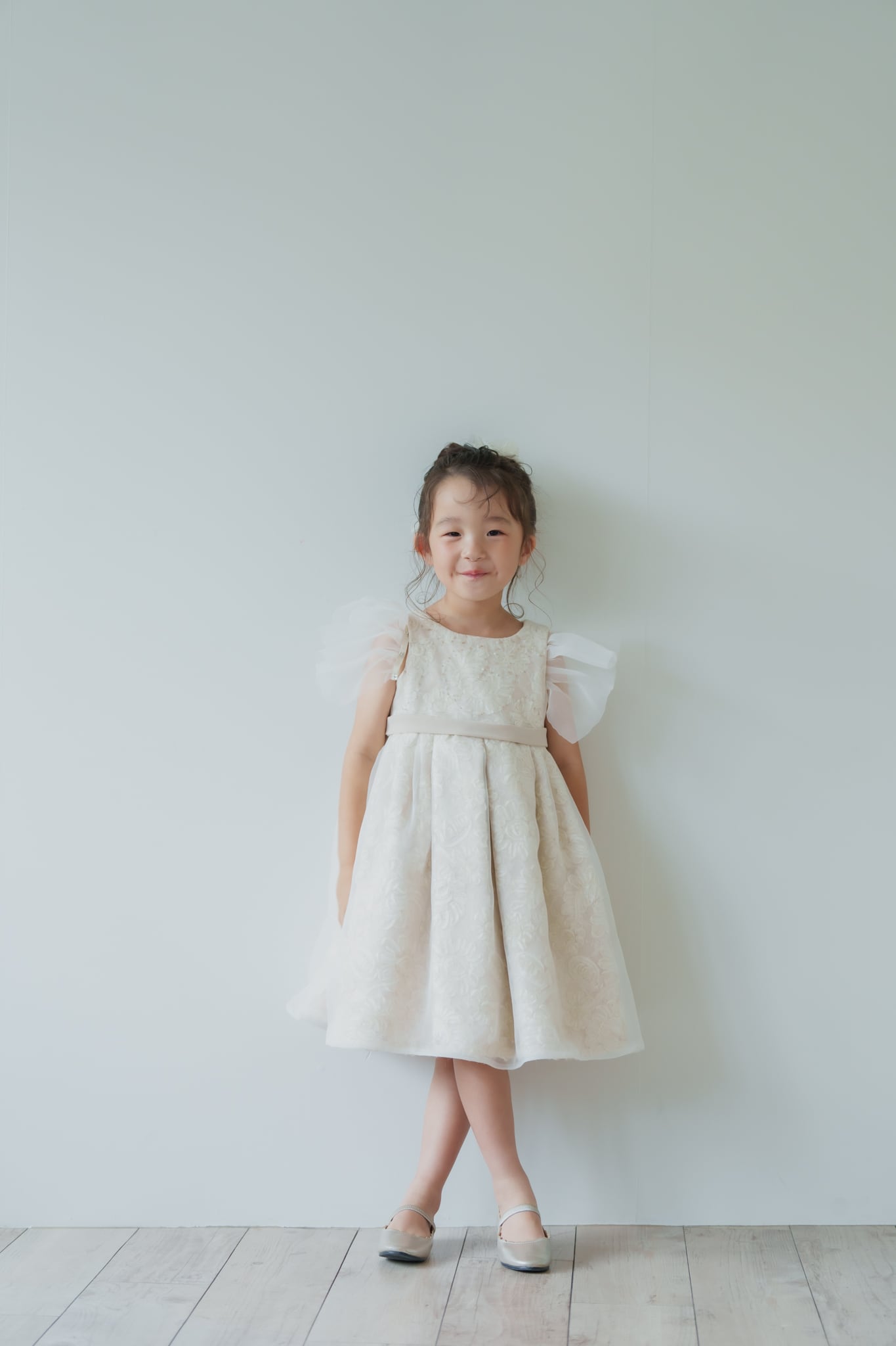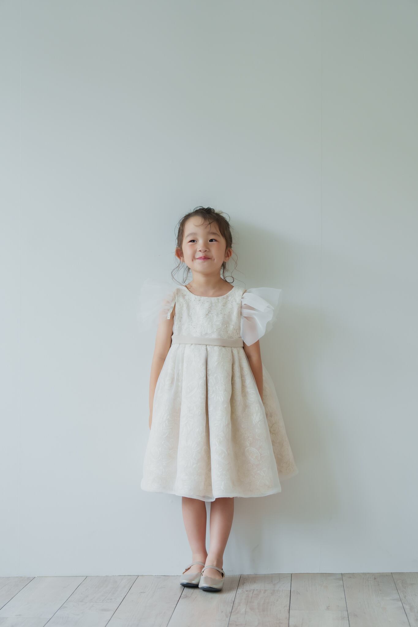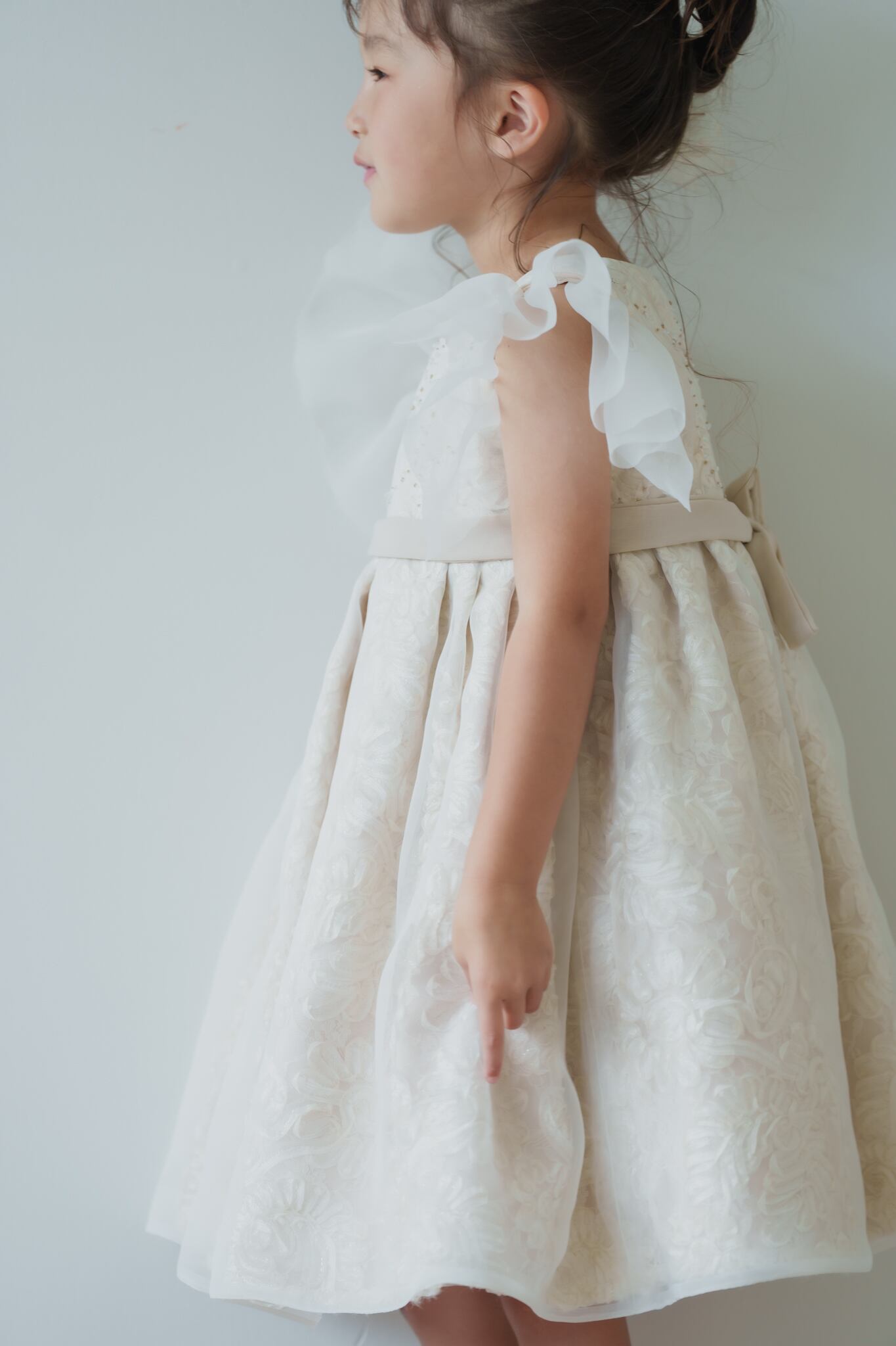 華やかなリボン刺繍の生地にシフォンを重ね上品なグレージュカラーで仕上げました。