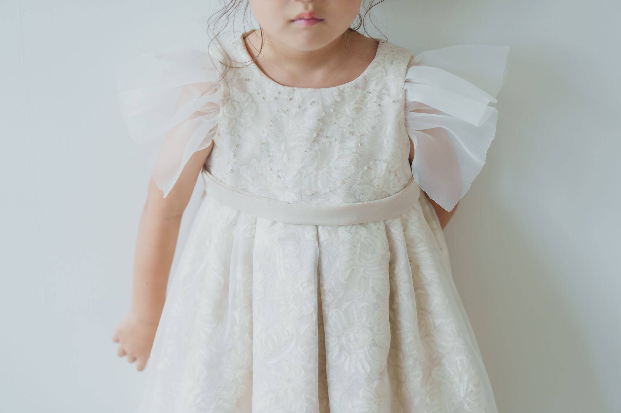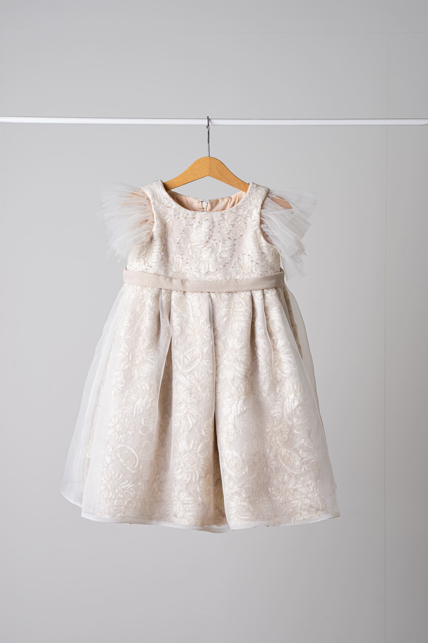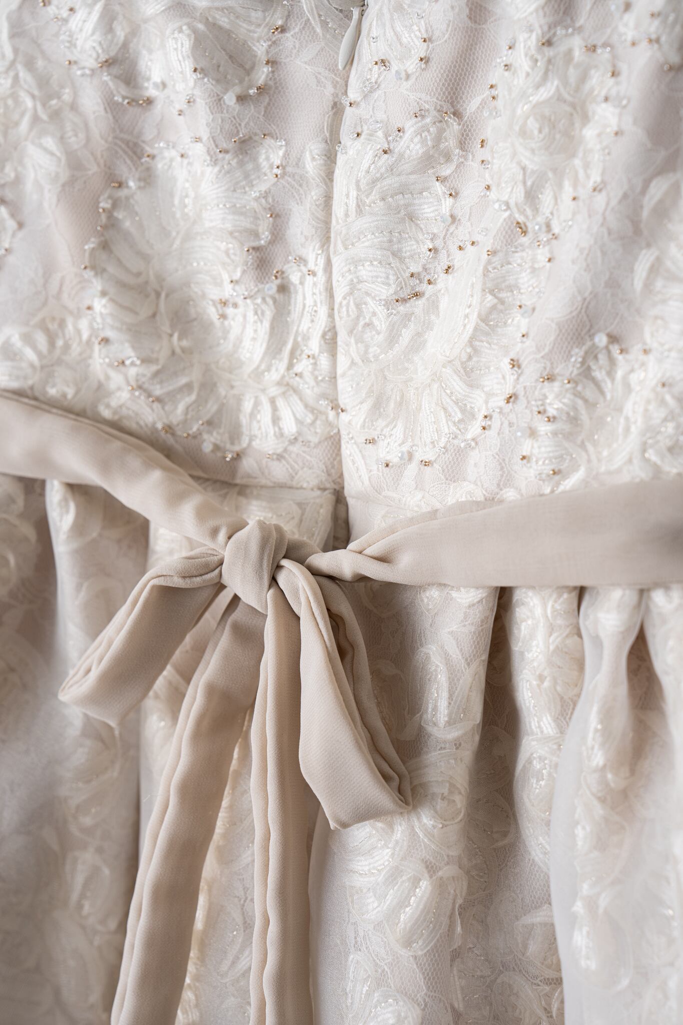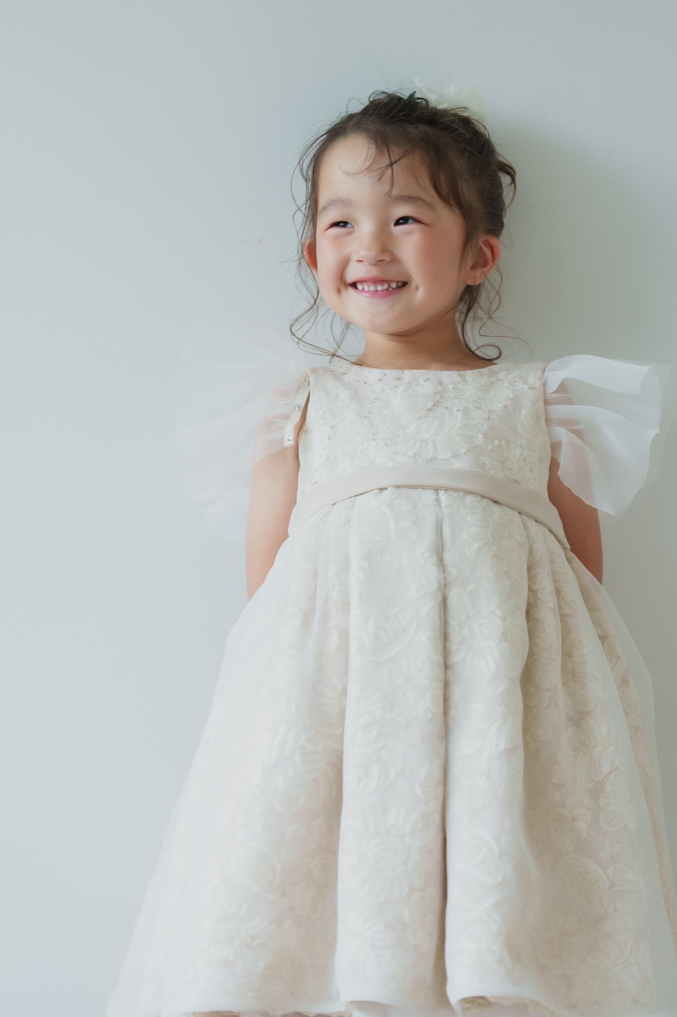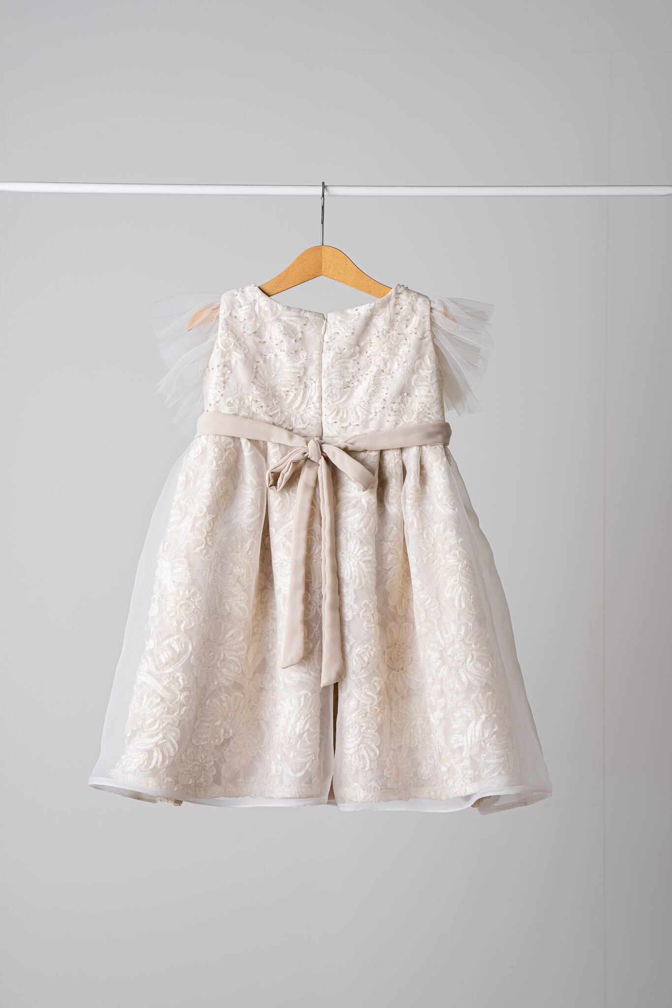 華やかなリボン刺繍の生地にシフォンを重ね上品なグレージュカラーで仕上げました。