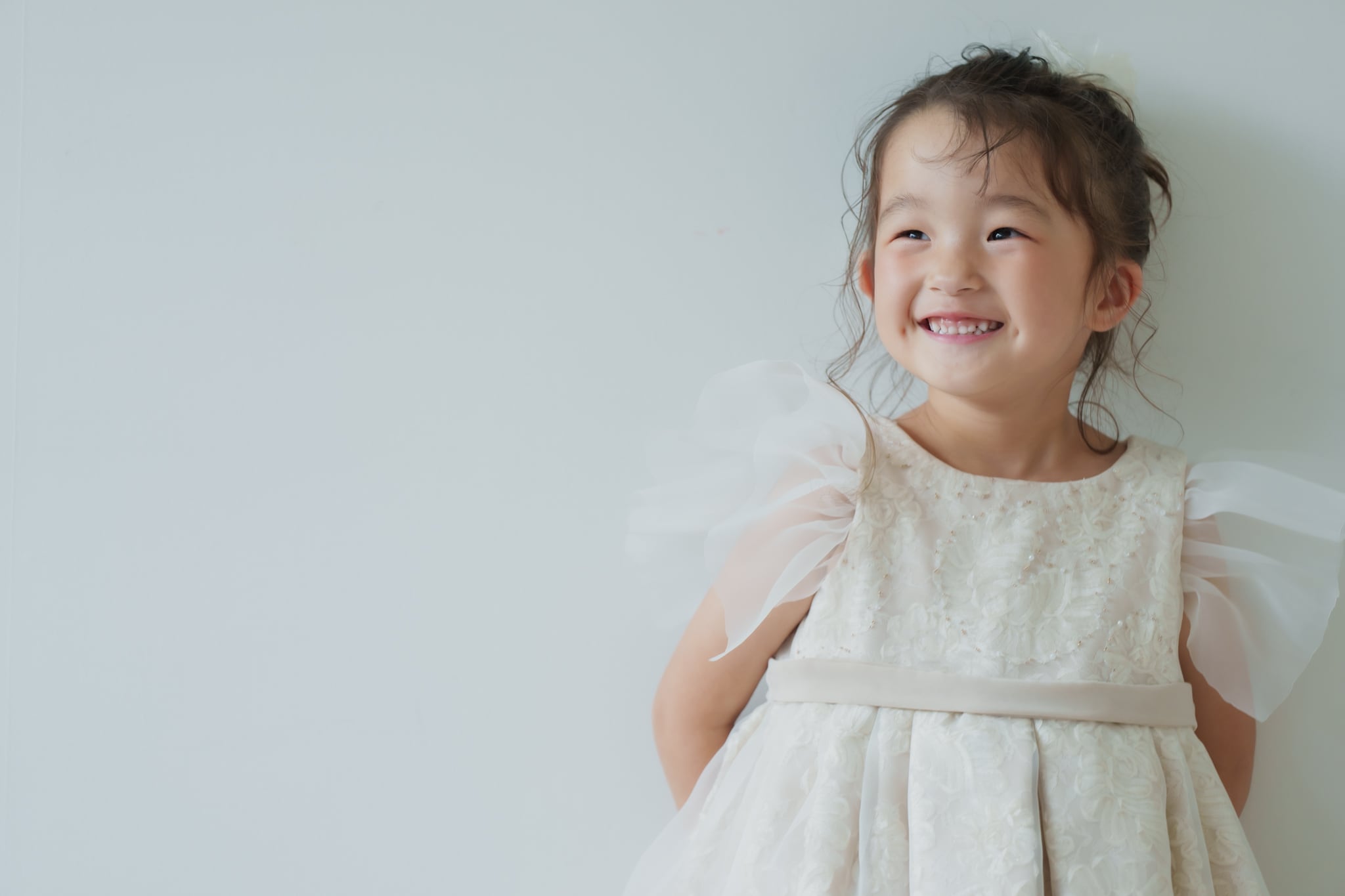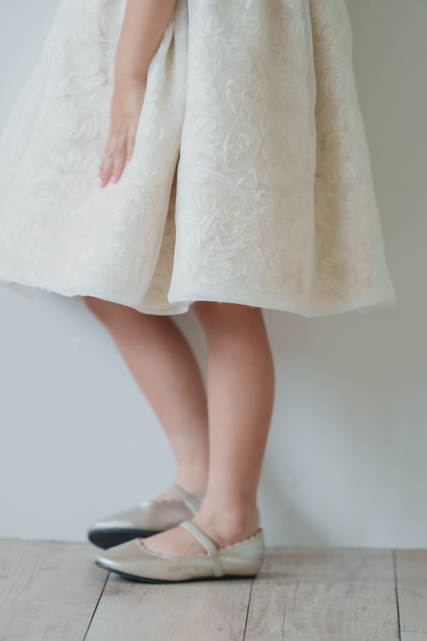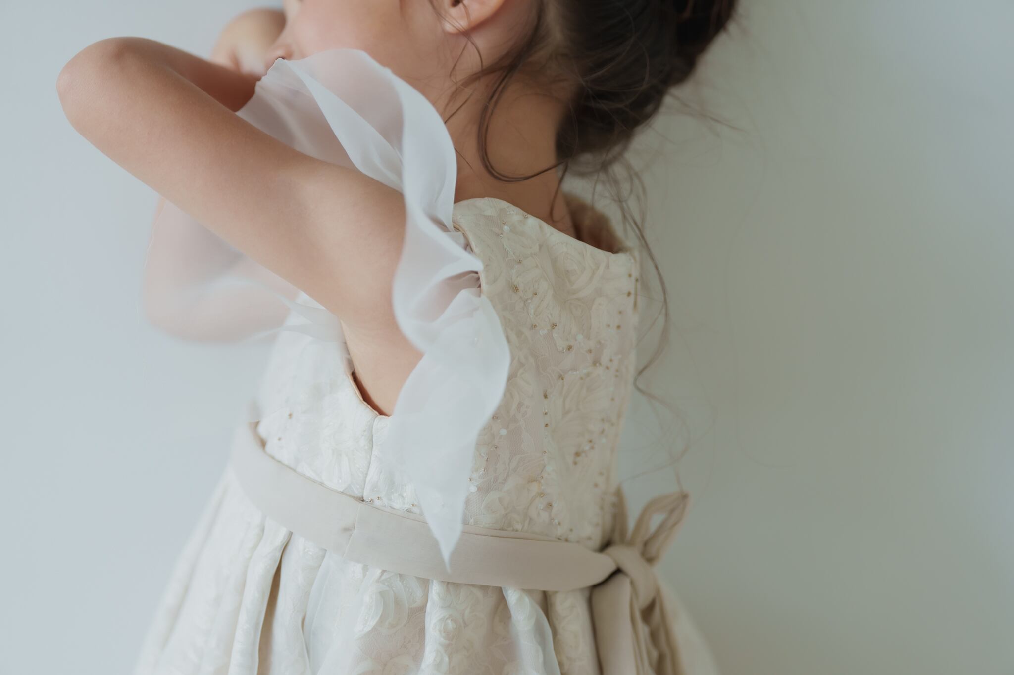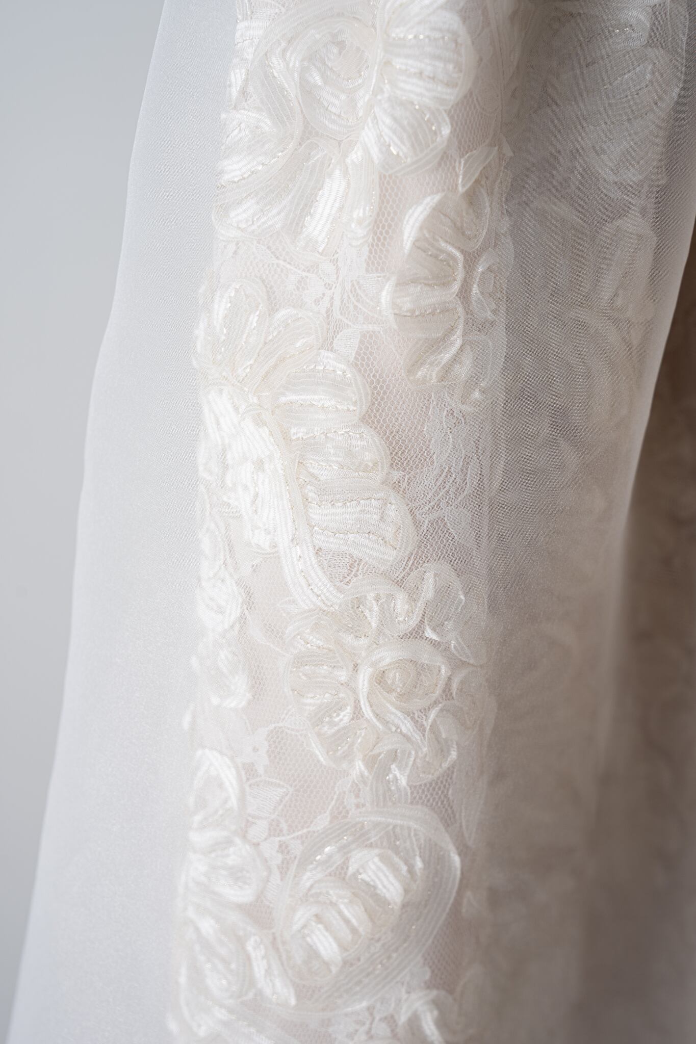 華やかなリボン刺繍の生地にシフォンを重ね上品なグレージュカラーで仕上げました。