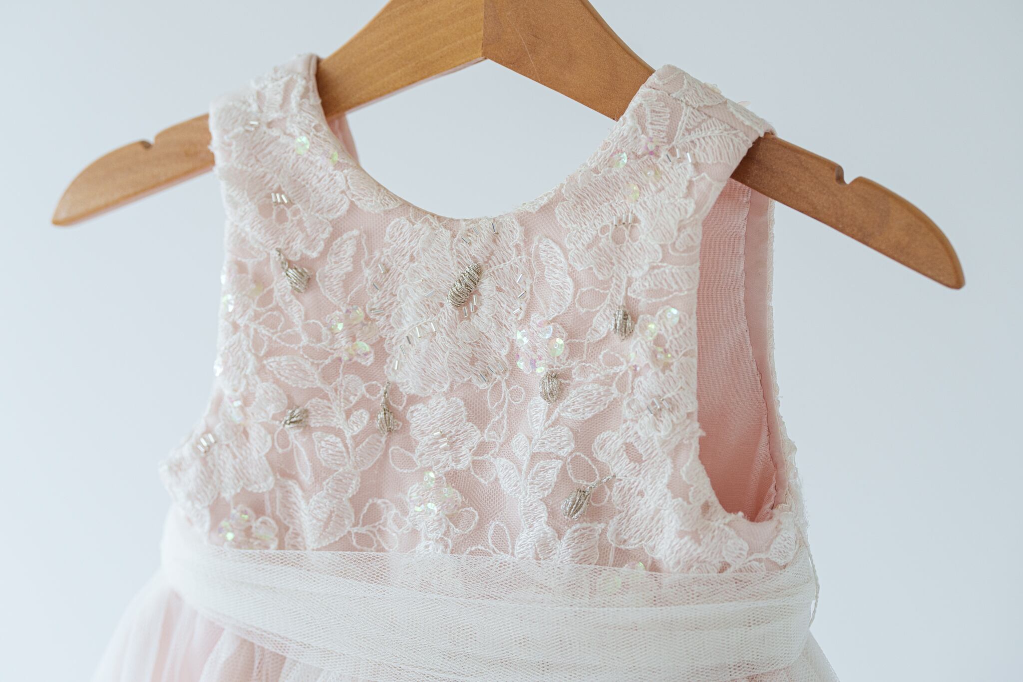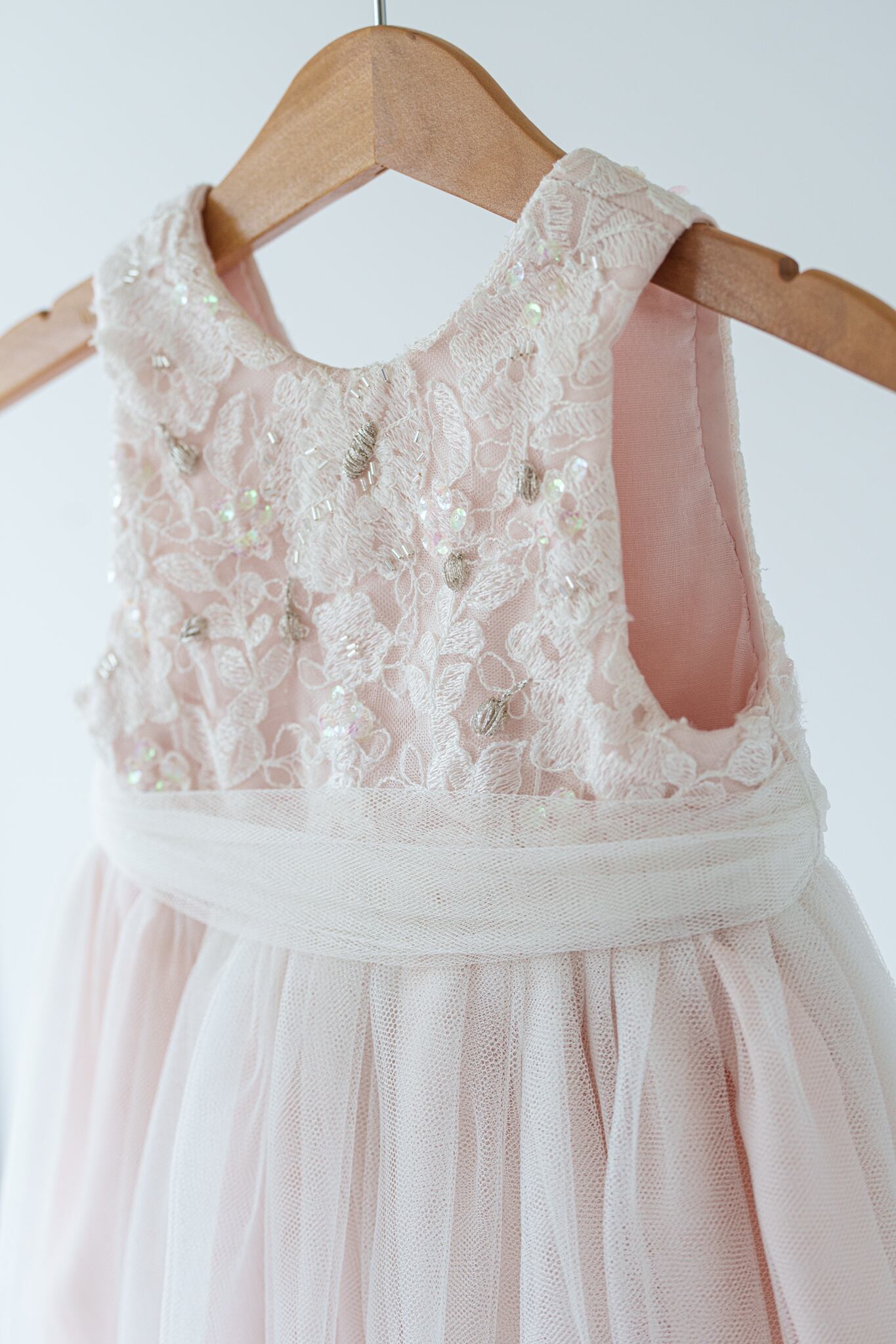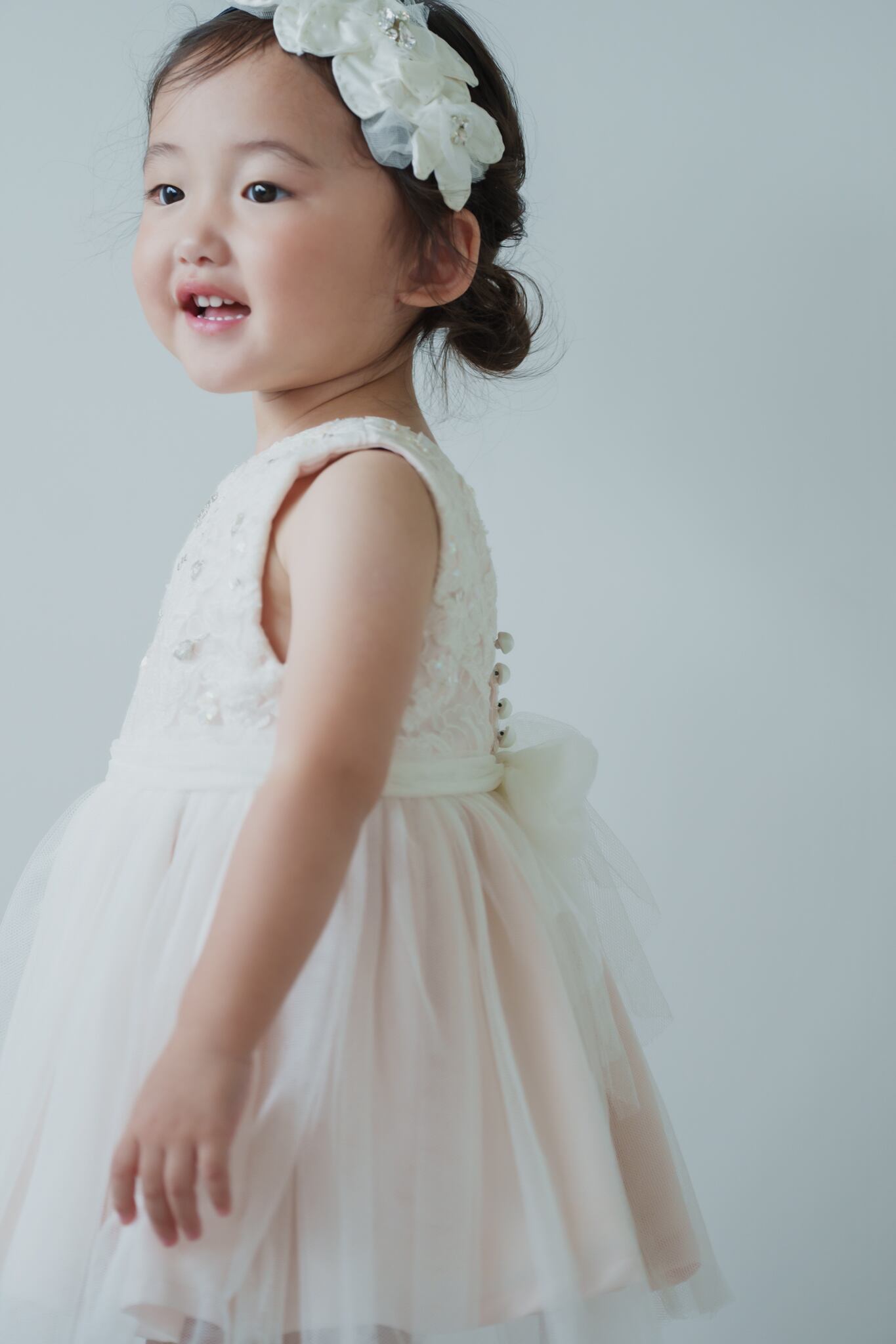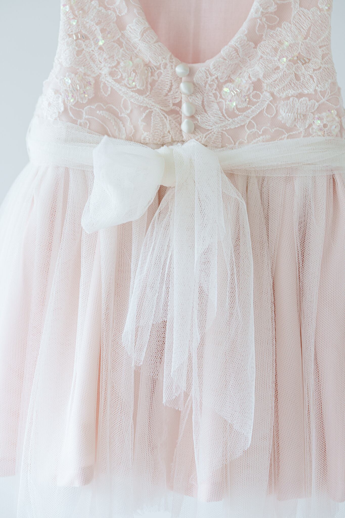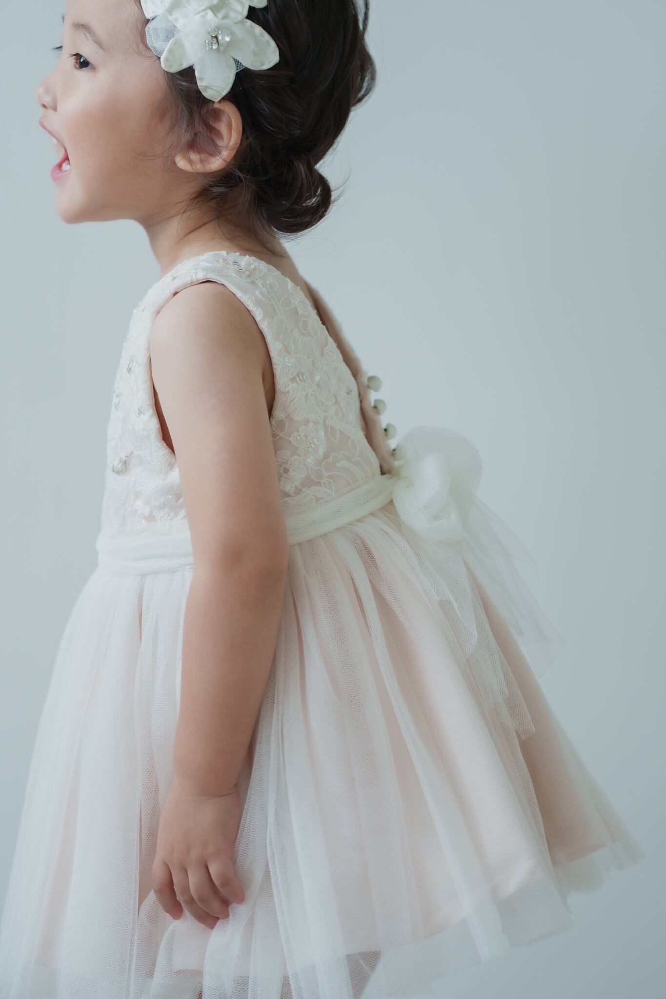 淡いベビーピンクのカラーに柔らかいチュールを重ねフワッとボリュームを出しています。胸元にはスパンコールや刺繍を入れて華やかに仕上げました。