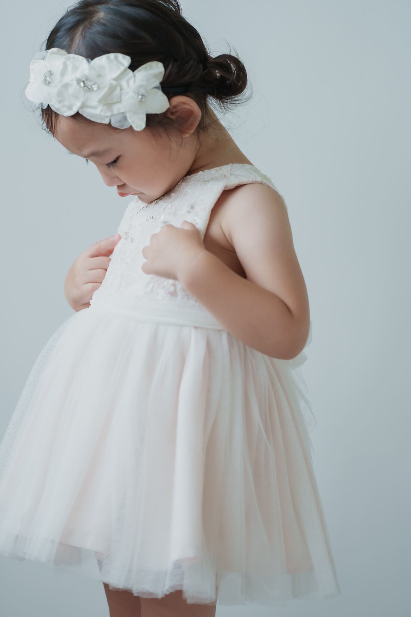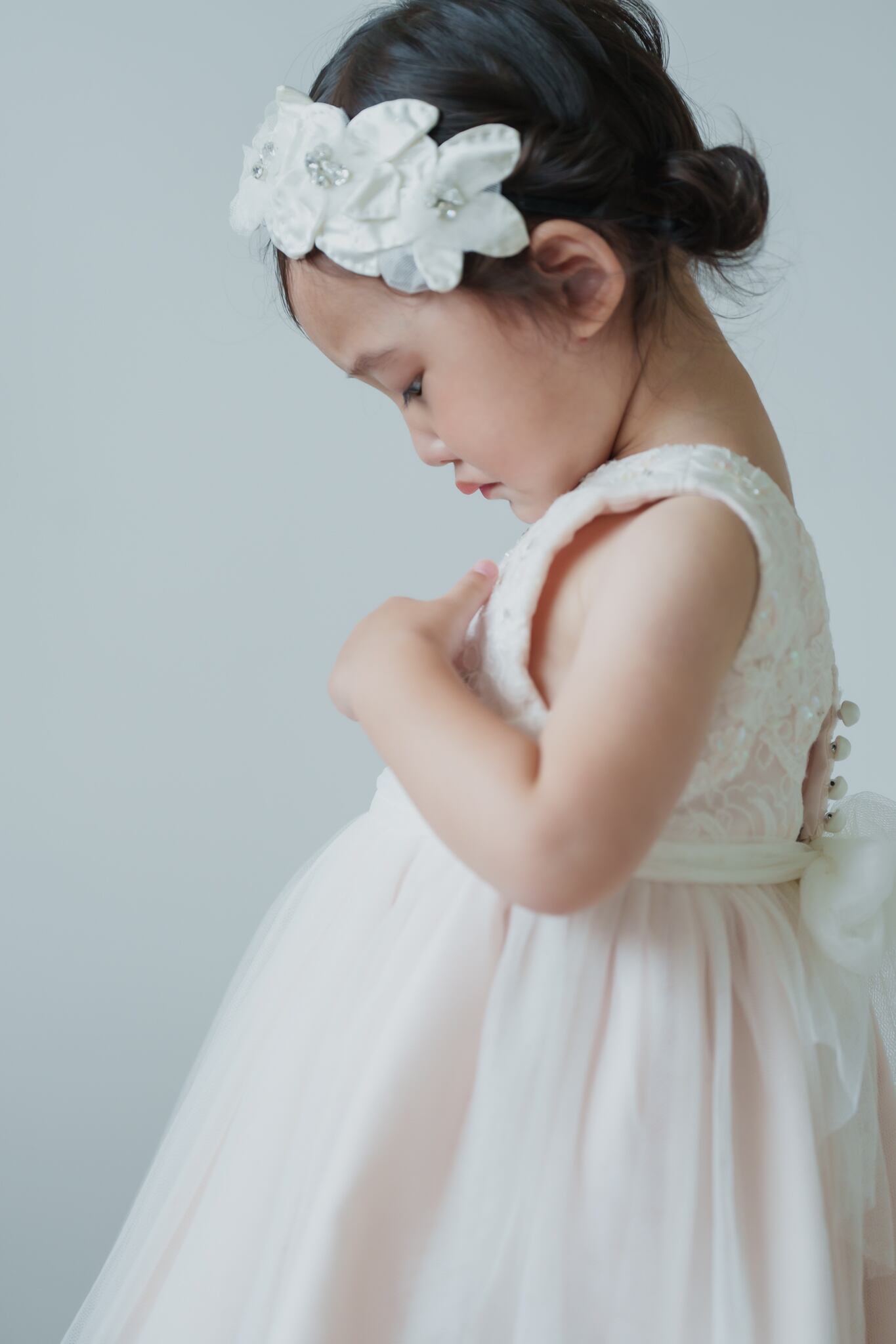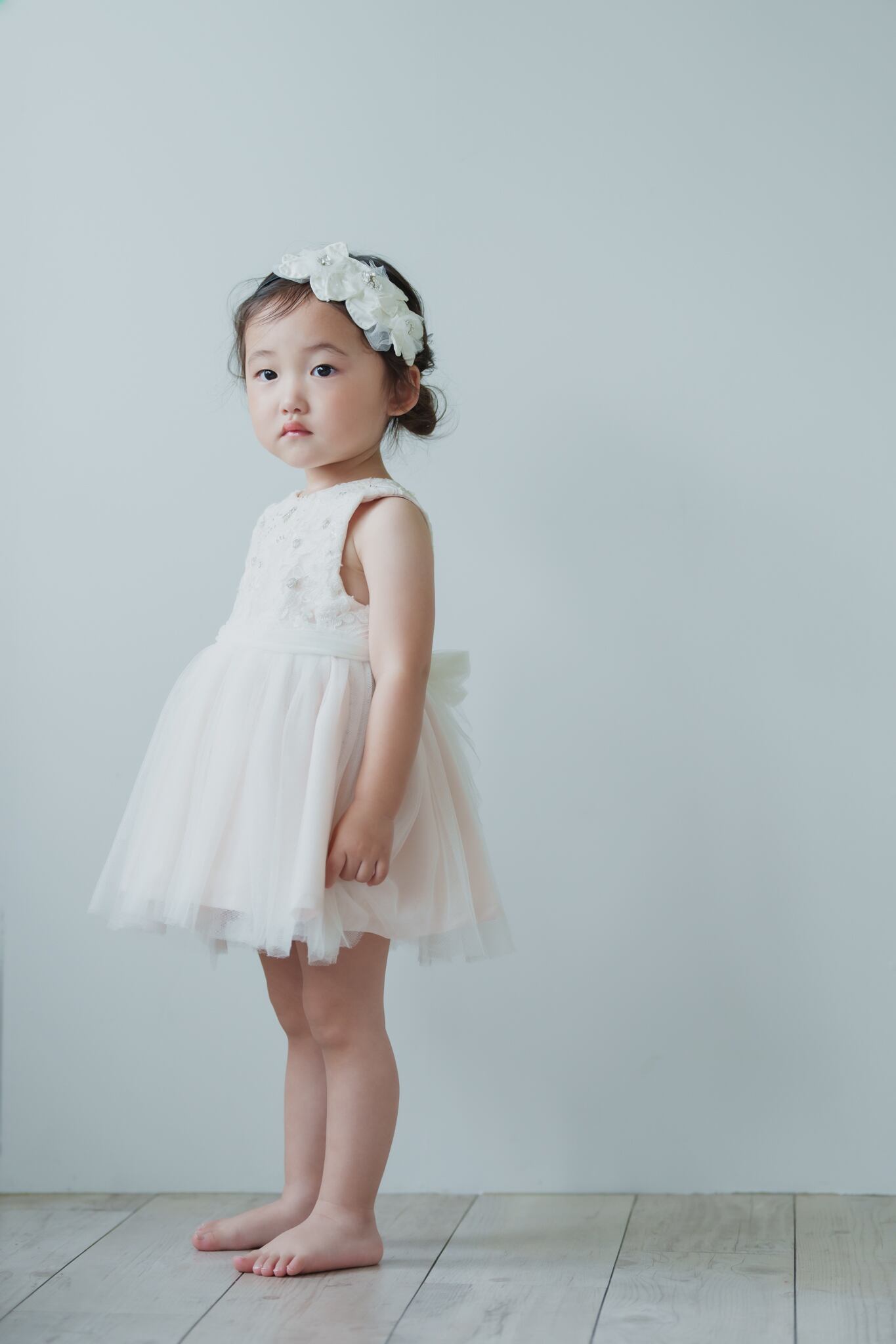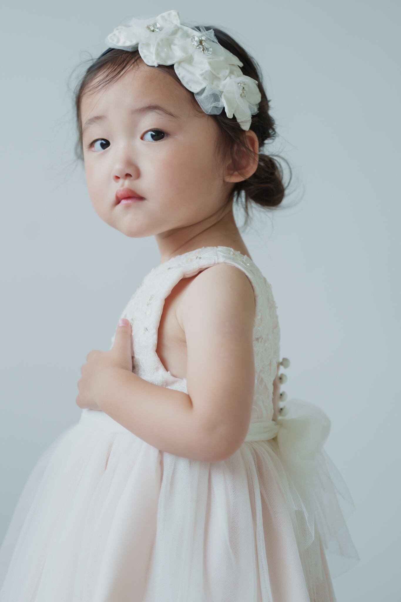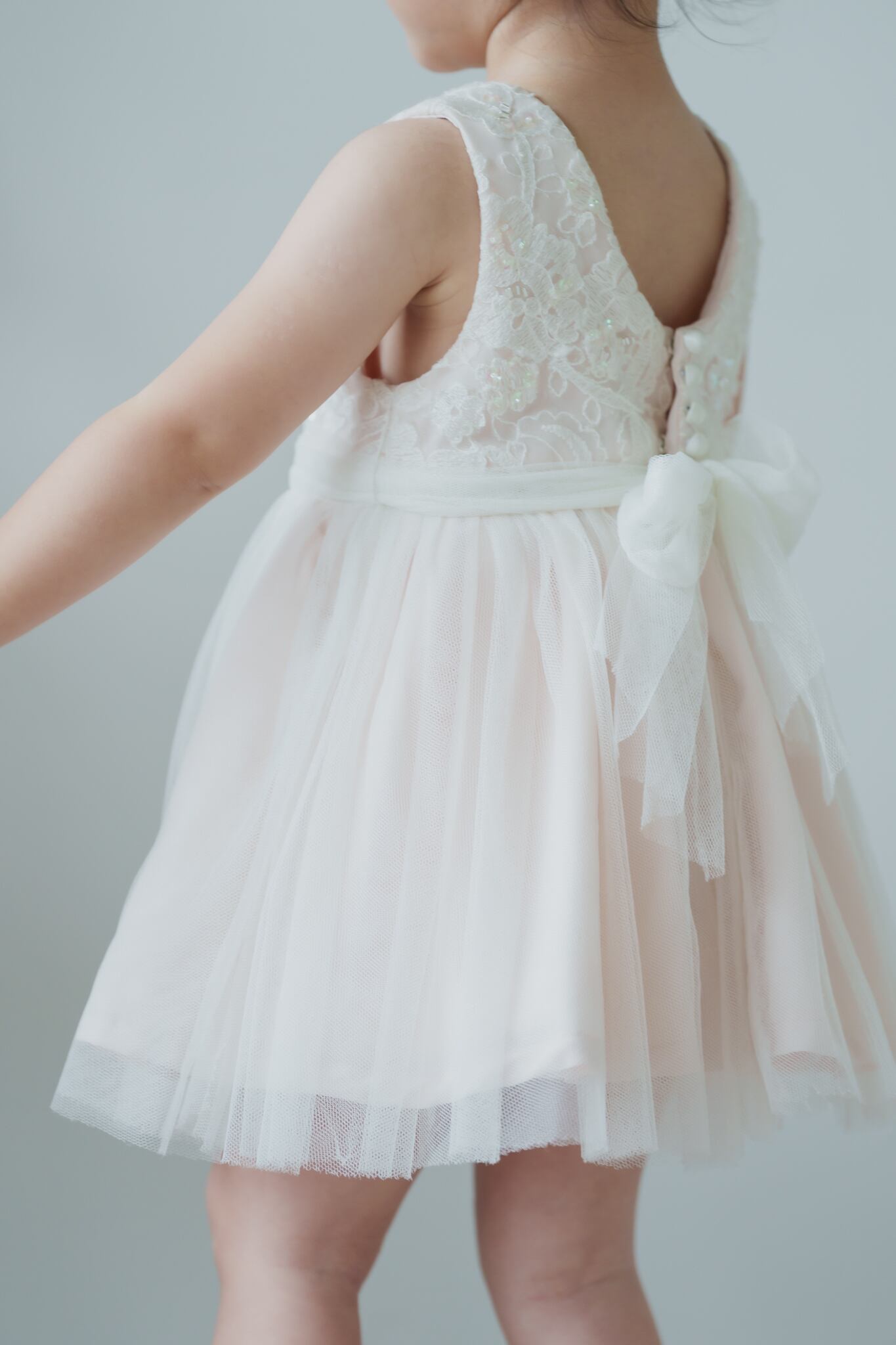 淡いベビーピンクのカラーに柔らかいチュールを重ねフワッとボリュームを出しています。胸元にはスパンコールや刺繍を入れて華やかに仕上げました。