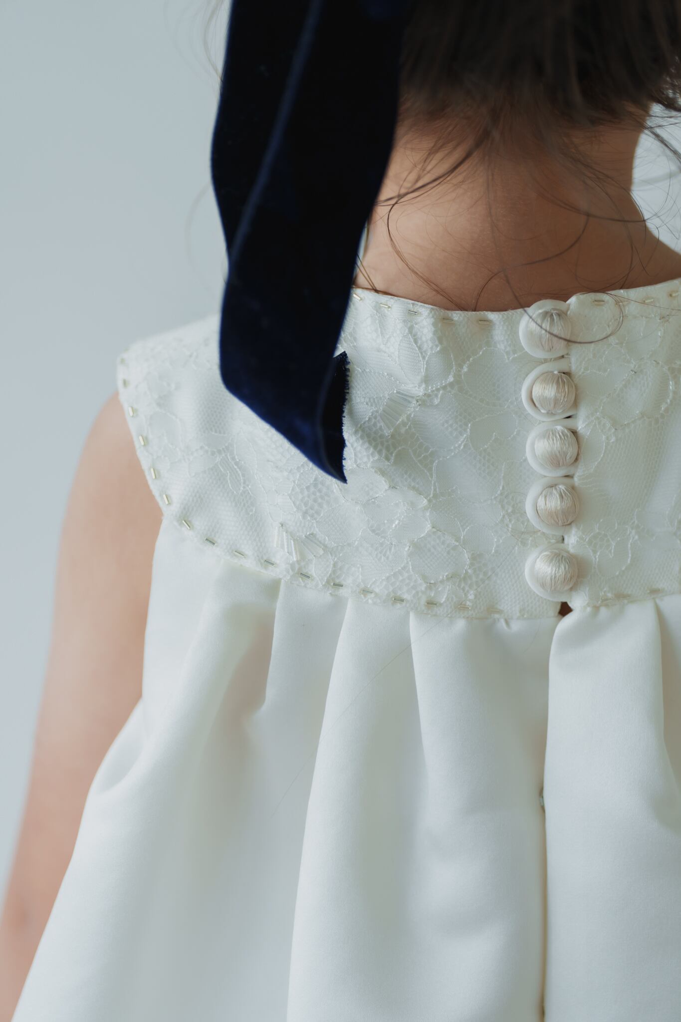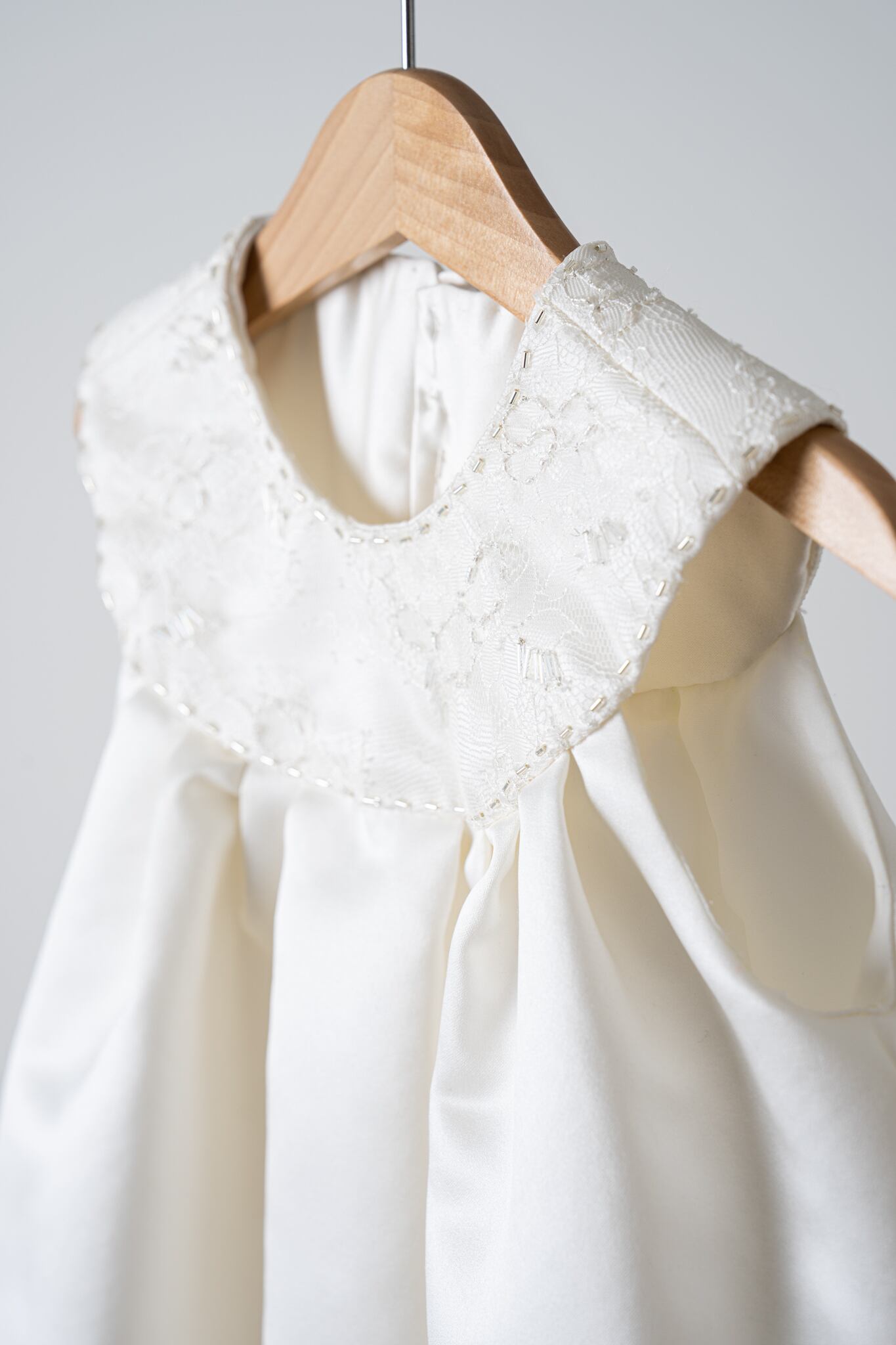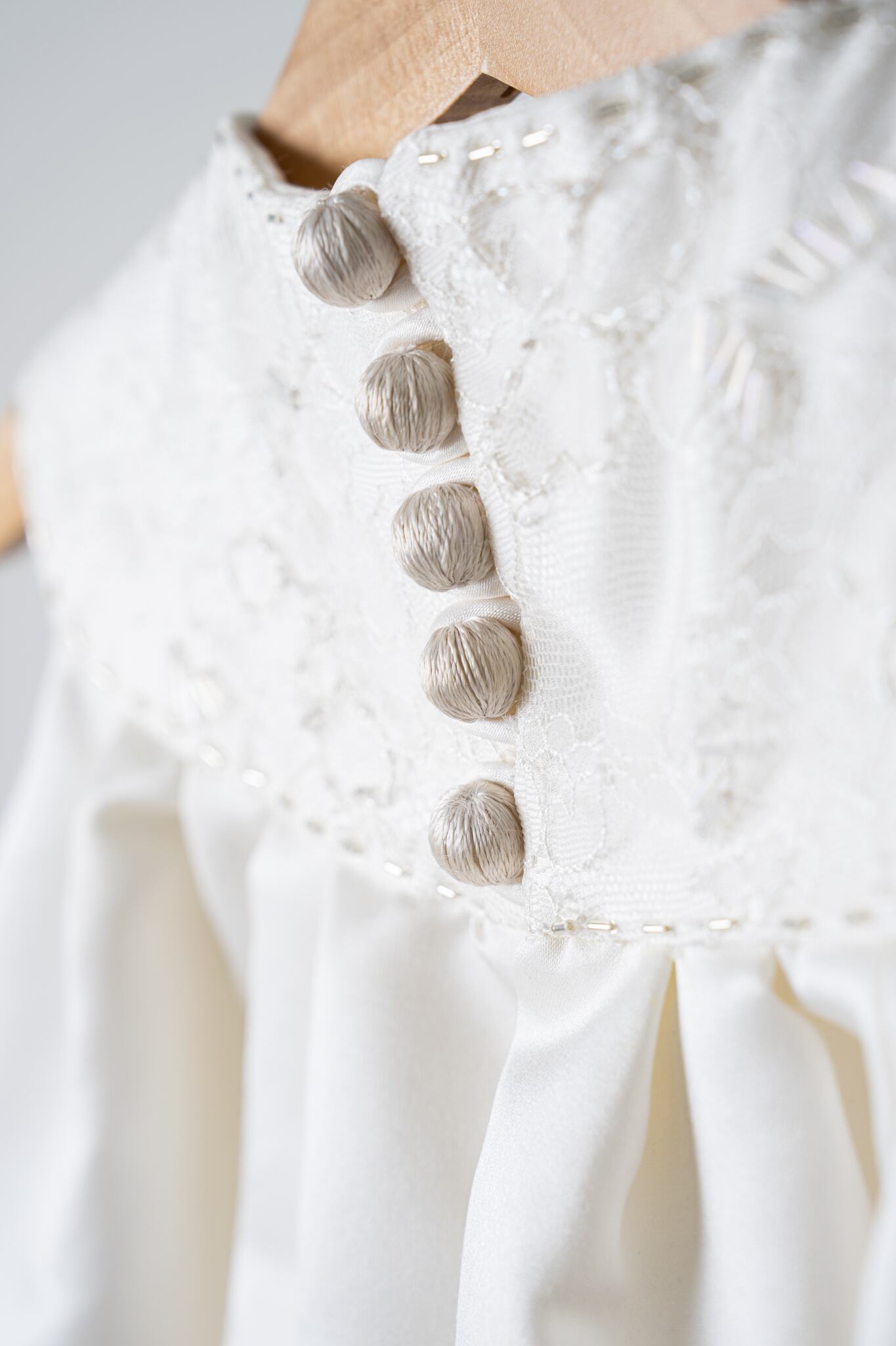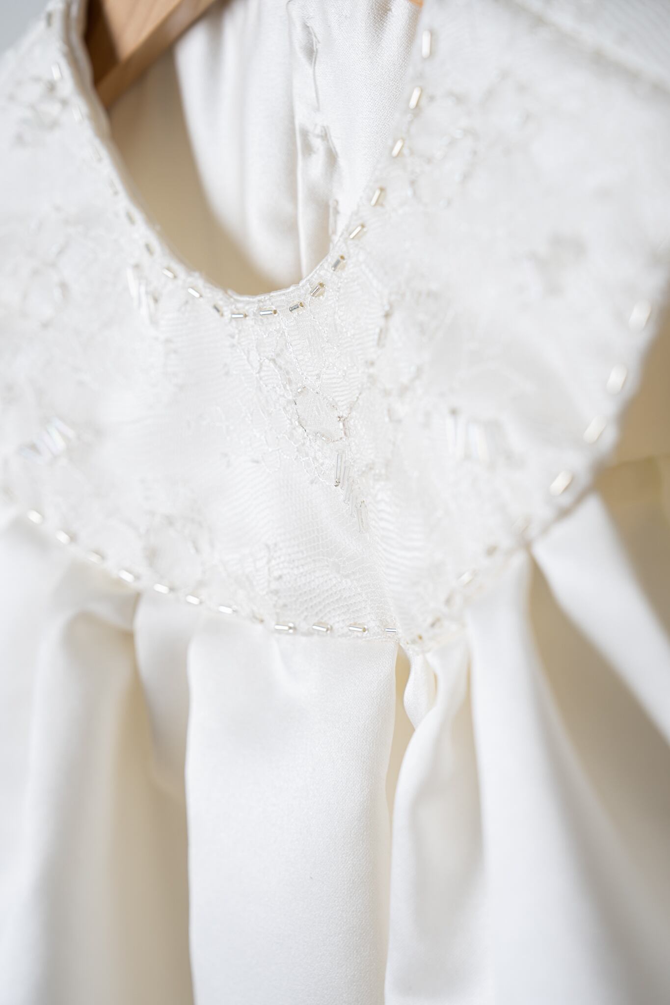 オフホワイトの上品なウェディングサテンで製作したAラインシルエットのドレス。胸元にはシルバービーズで丁寧にステッチを施しています。
