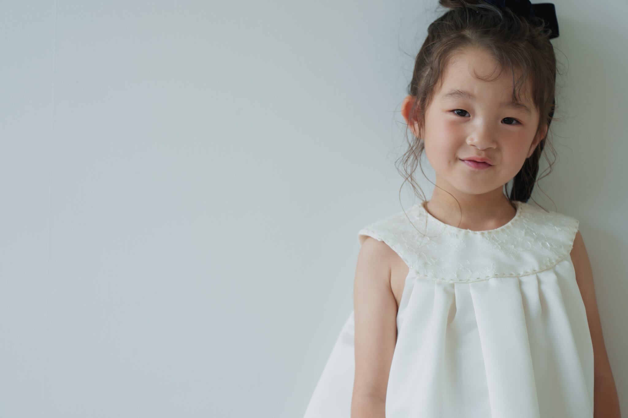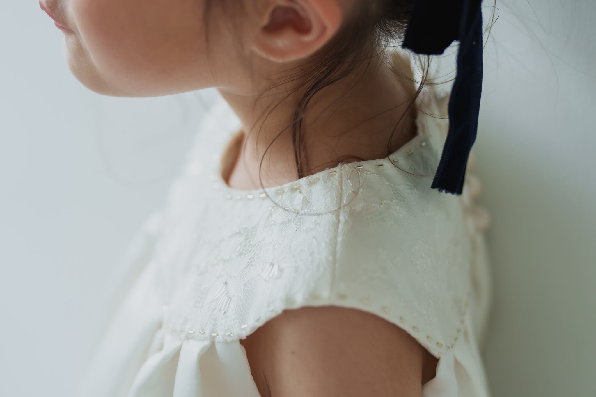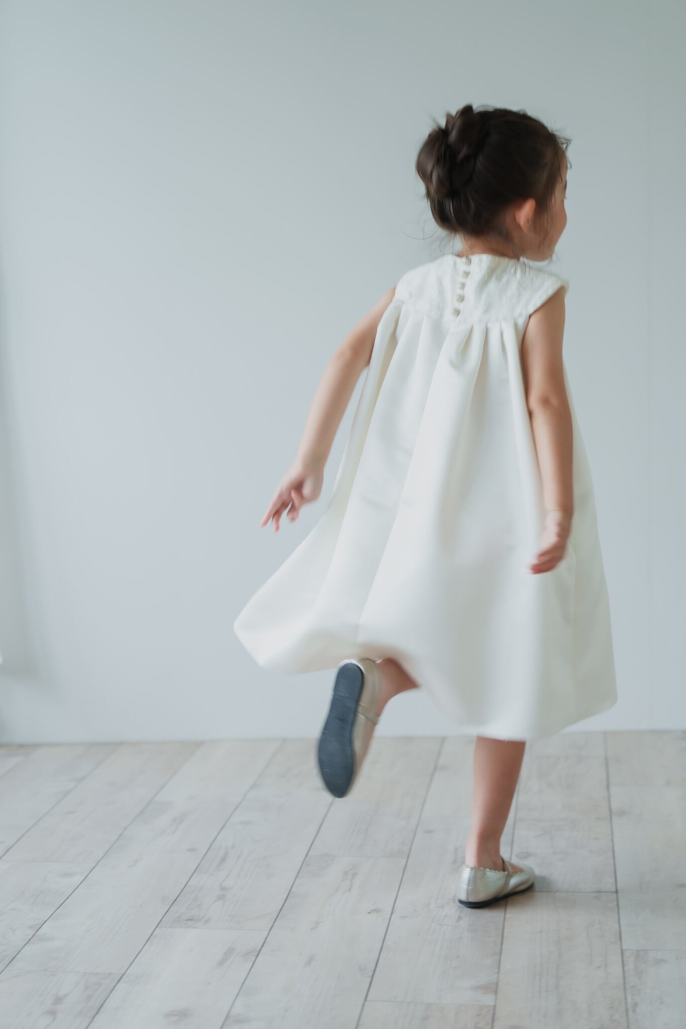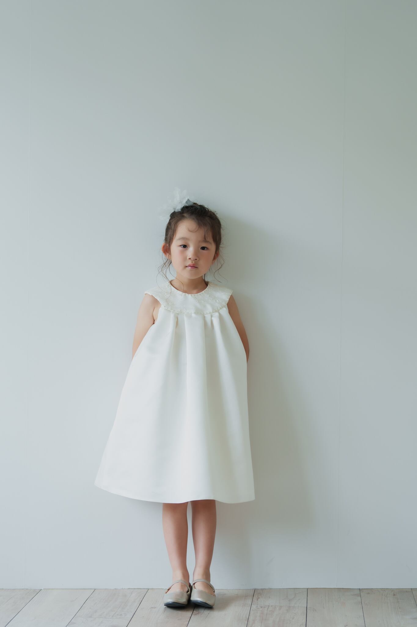 オフホワイトの上品なウェディングサテンで製作したAラインシルエットのドレス。胸元にはシルバービーズで丁寧にステッチを施しています。
