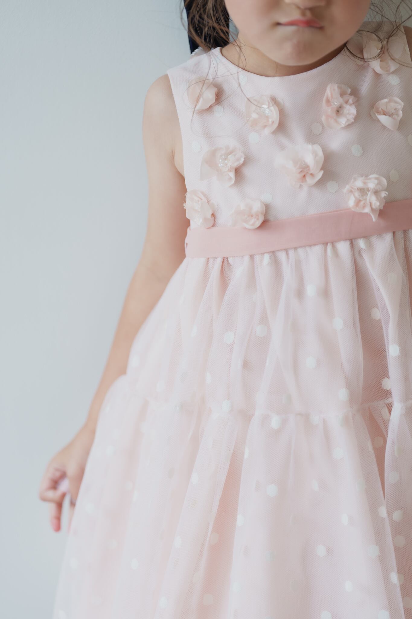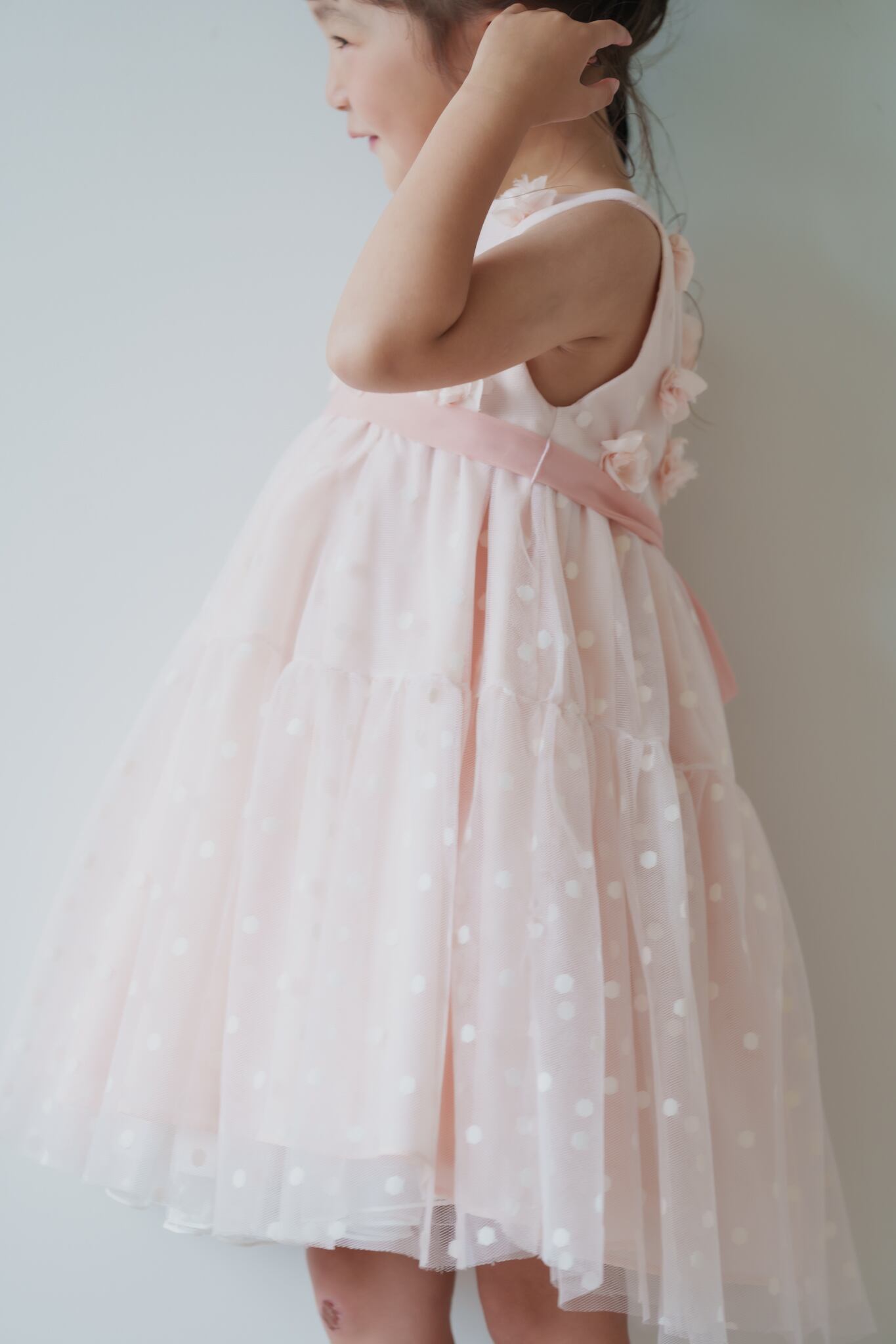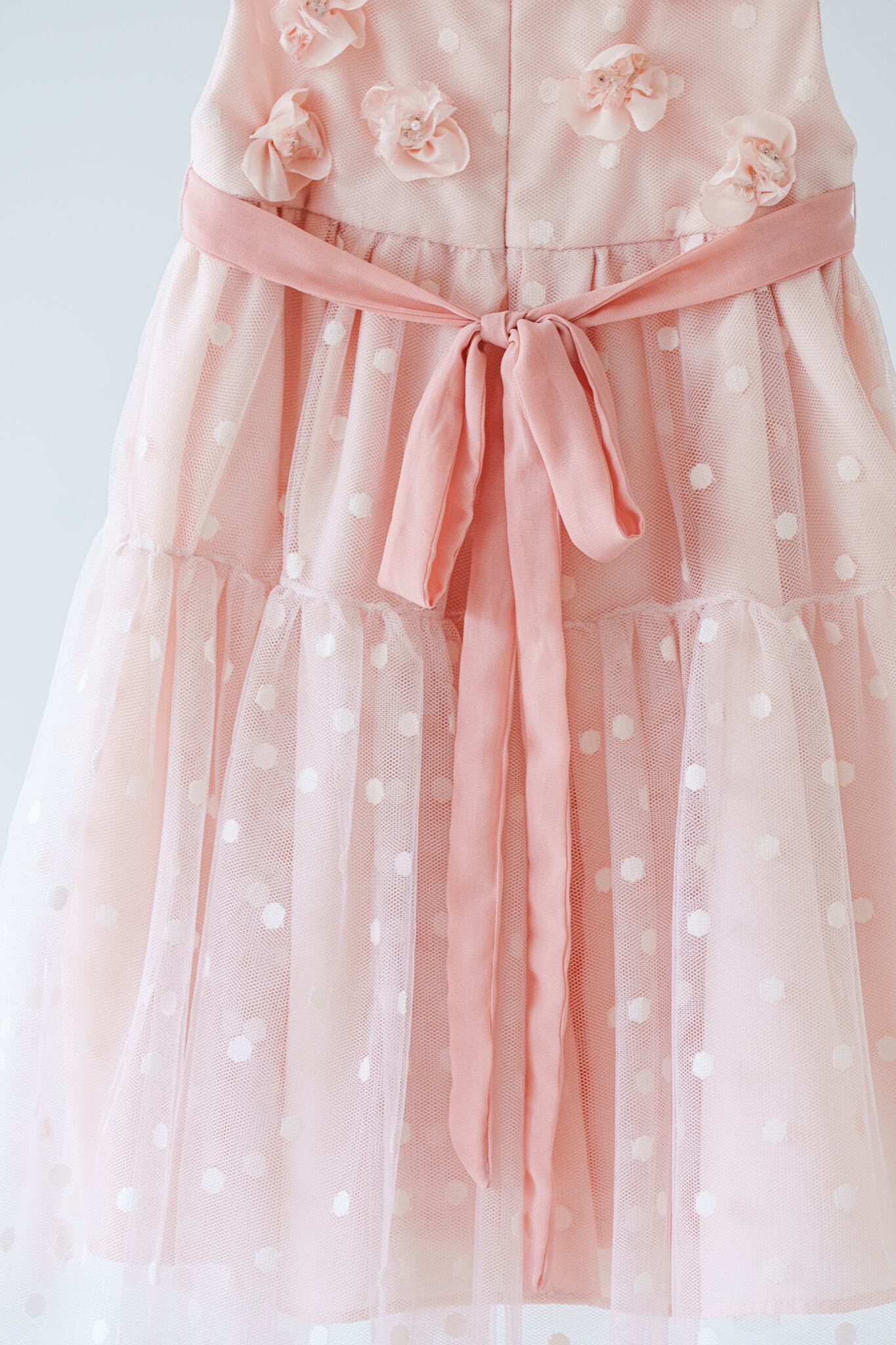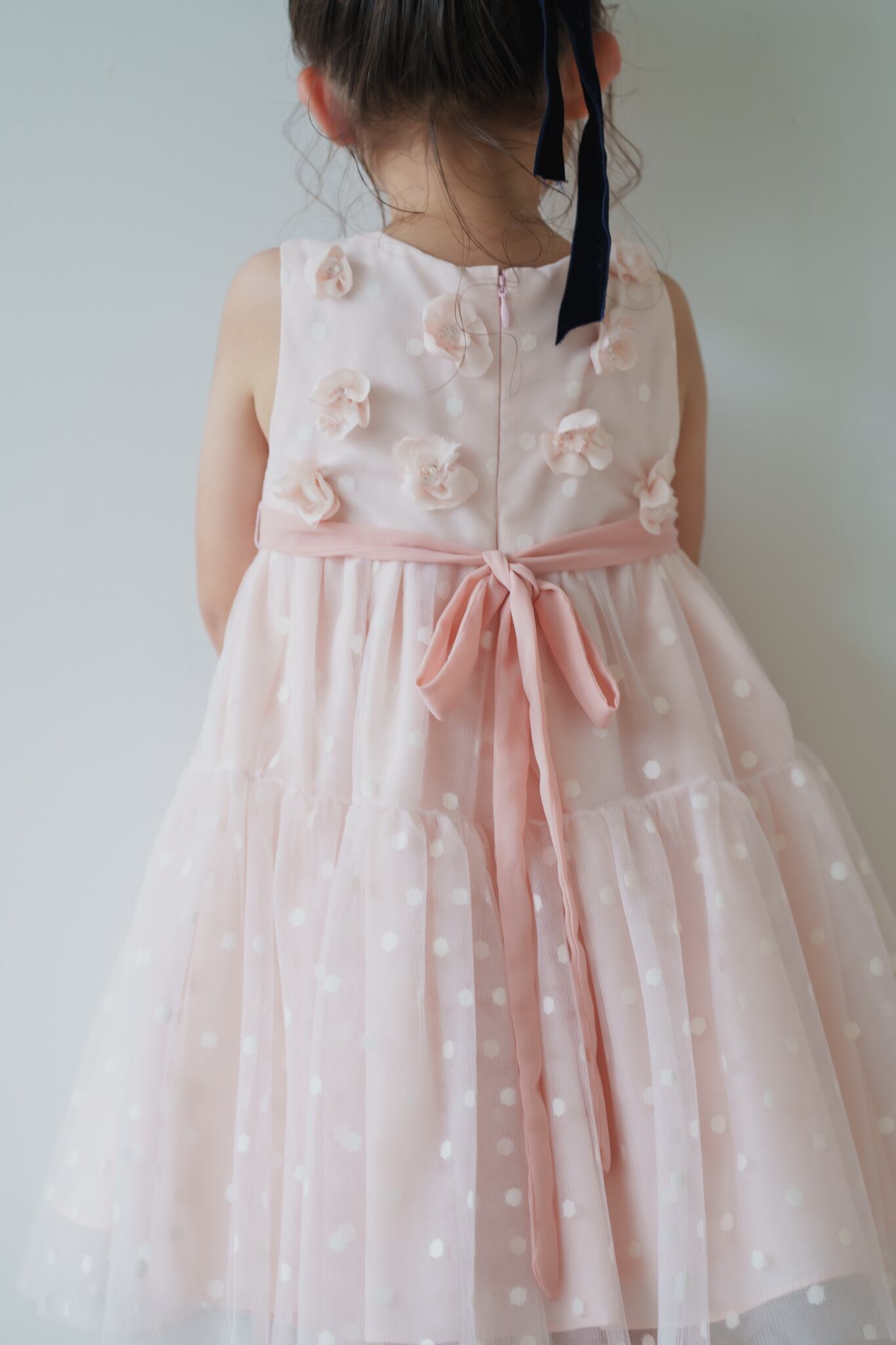 可愛らしいピンクのドットチュール生地に花びらを1枚ずつ重ね、ビーズやパールで丁寧に縫い付けています。薄手の生地でお作りしていますので春夏シーズンもおすすめ。お子様からも支持される人気のドレスです。