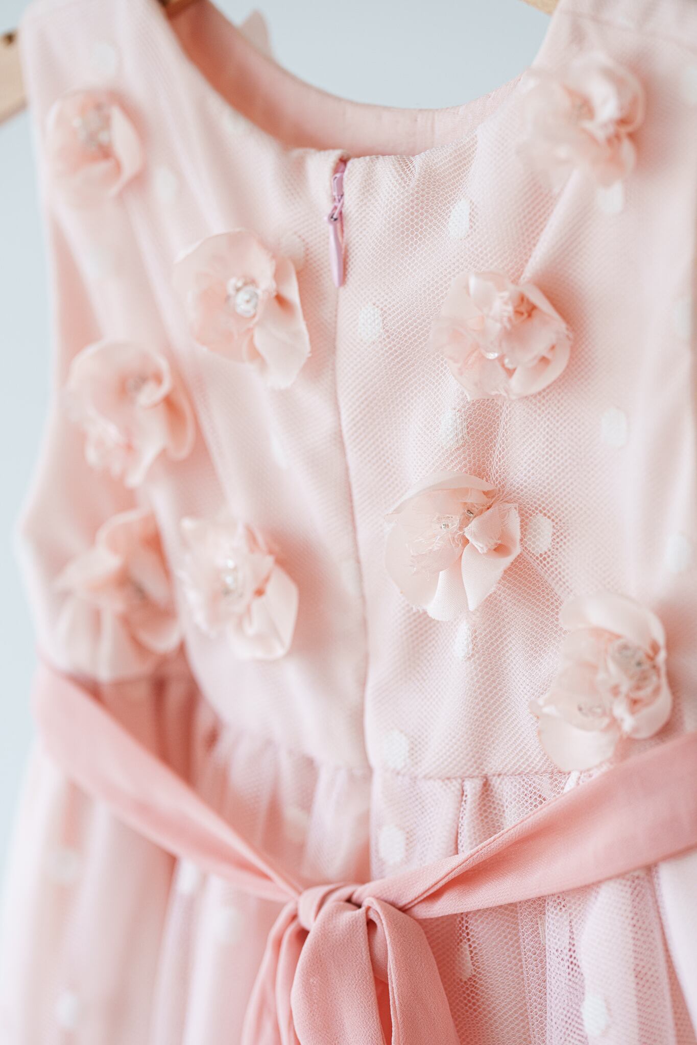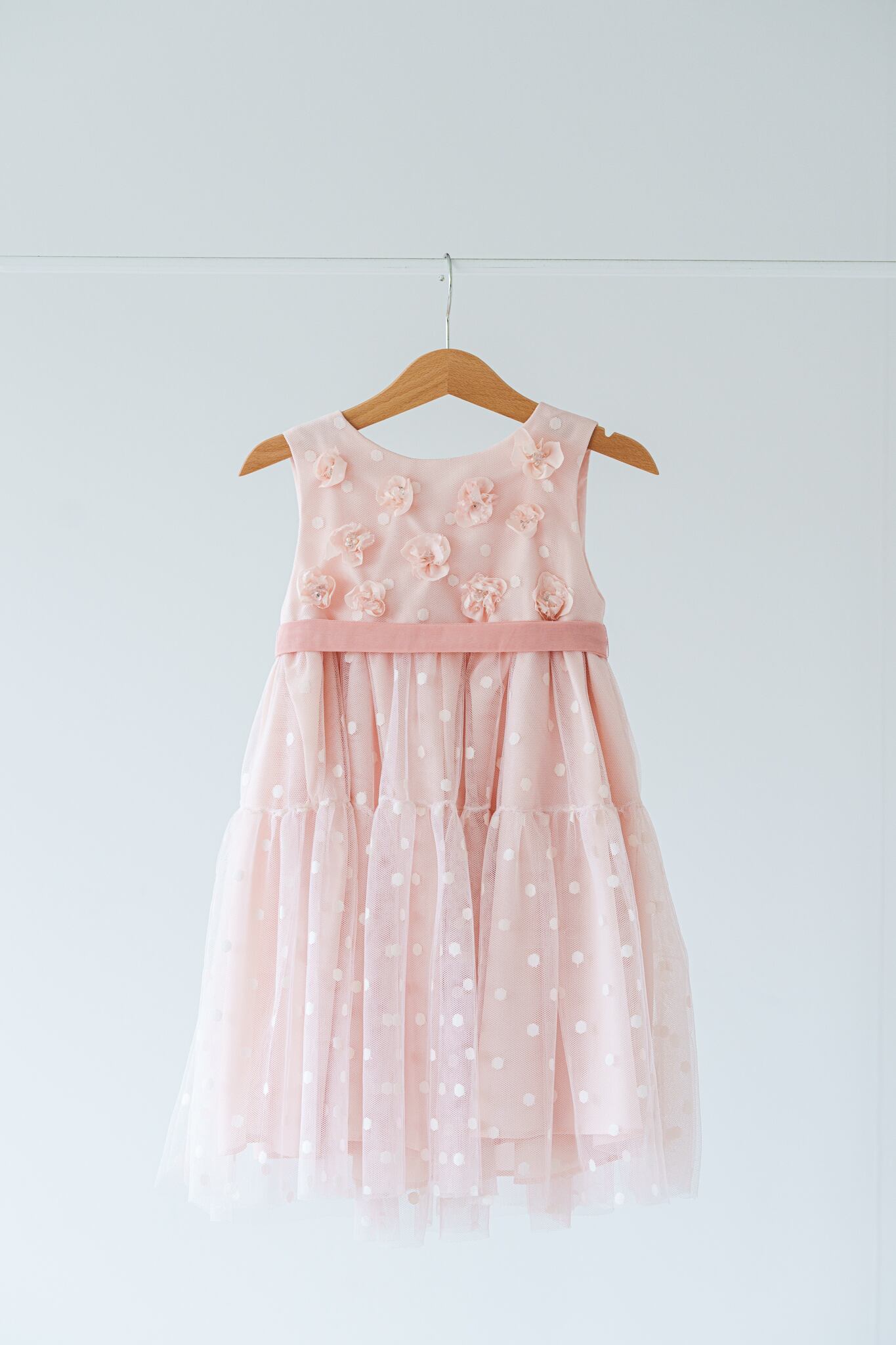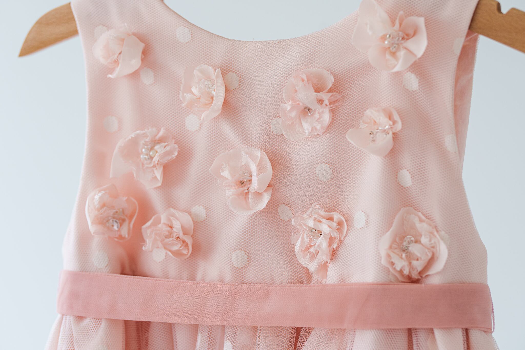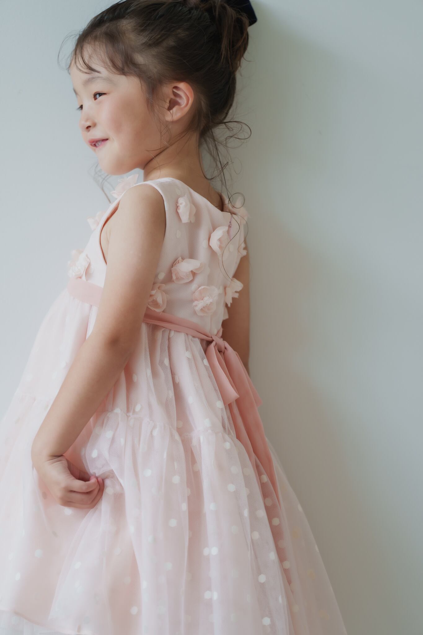 可愛らしいピンクのドットチュール生地に花びらを1枚ずつ重ね、ビーズやパールで丁寧に縫い付けています。薄手の生地でお作りしていますので春夏シーズンもおすすめ。お子様からも支持される人気のドレスです。