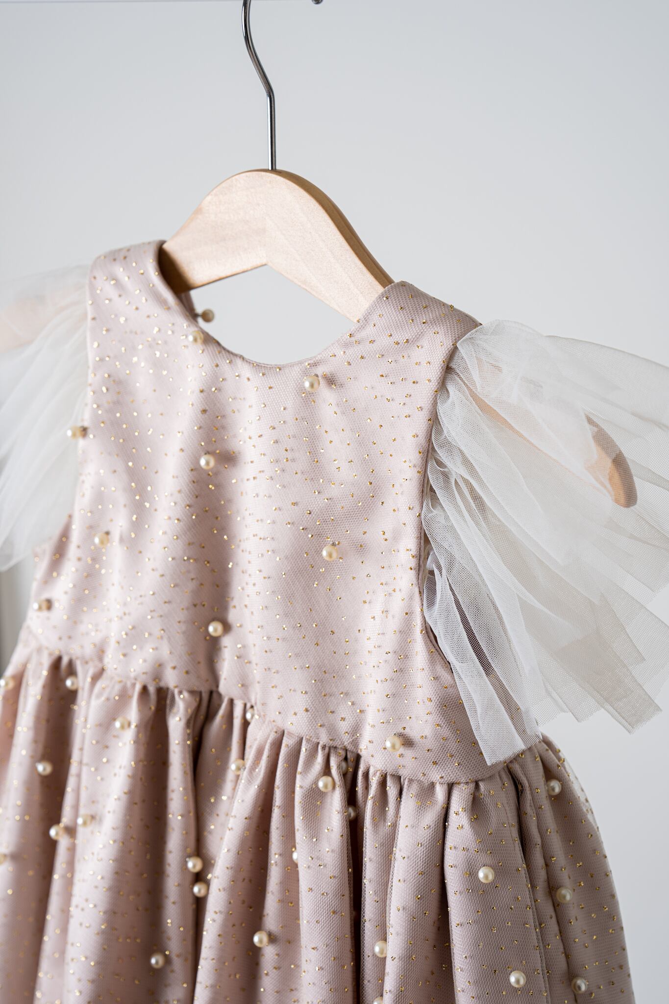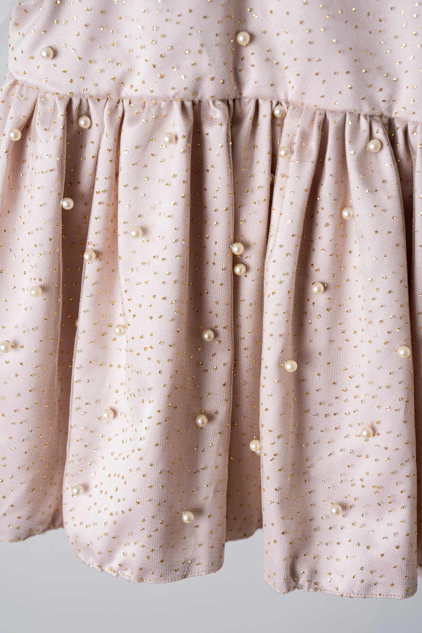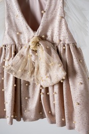 落ち着いたピンクのシャンパンカラーに粒々パールが散りばめられたドレス。 お袖は付け外しが可能です。 平置き採寸 着丈 40 バスト. 25(50)