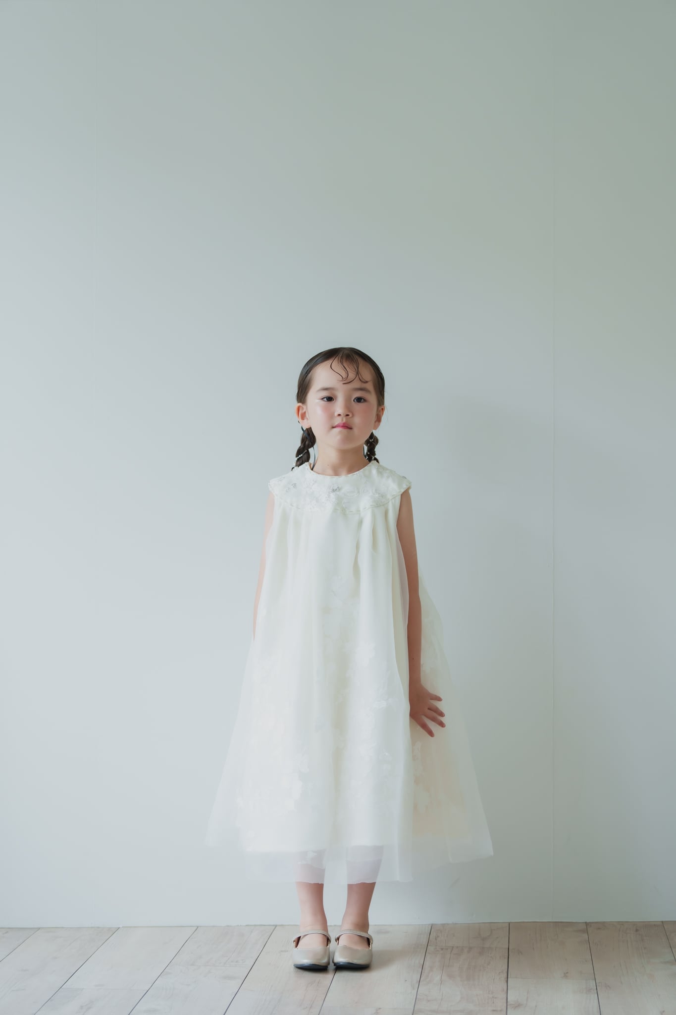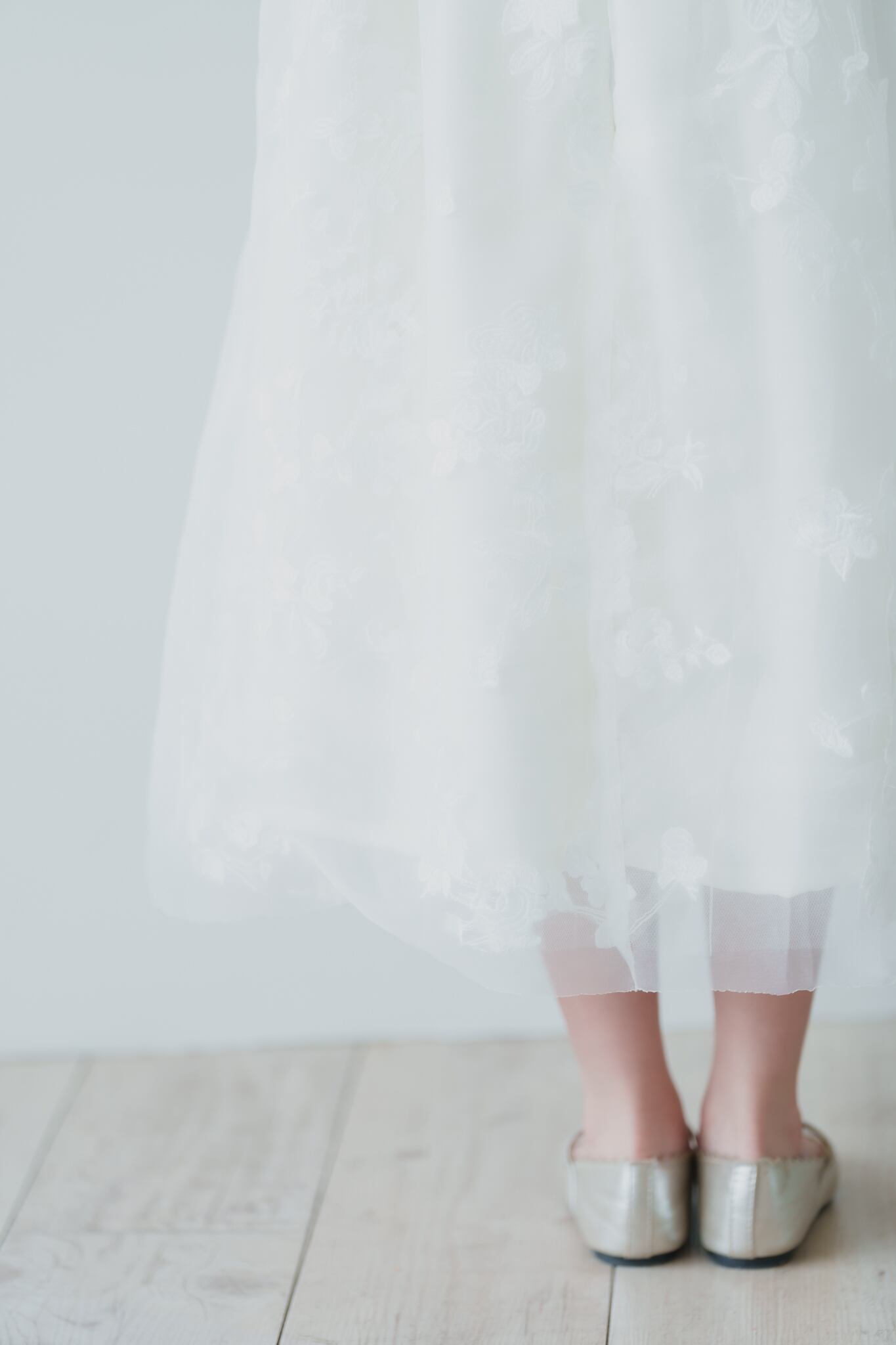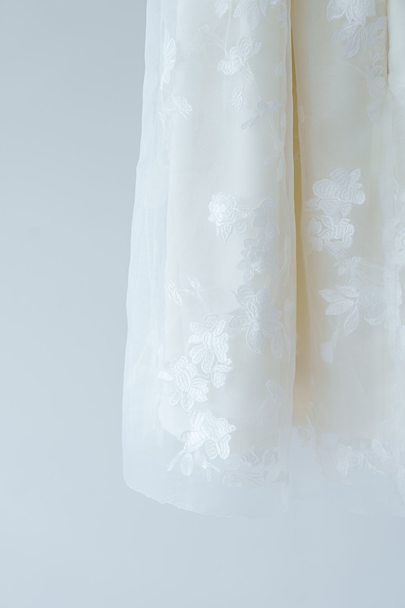 立体的なお花の刺繍がドレスに散りばめられているイメージです。