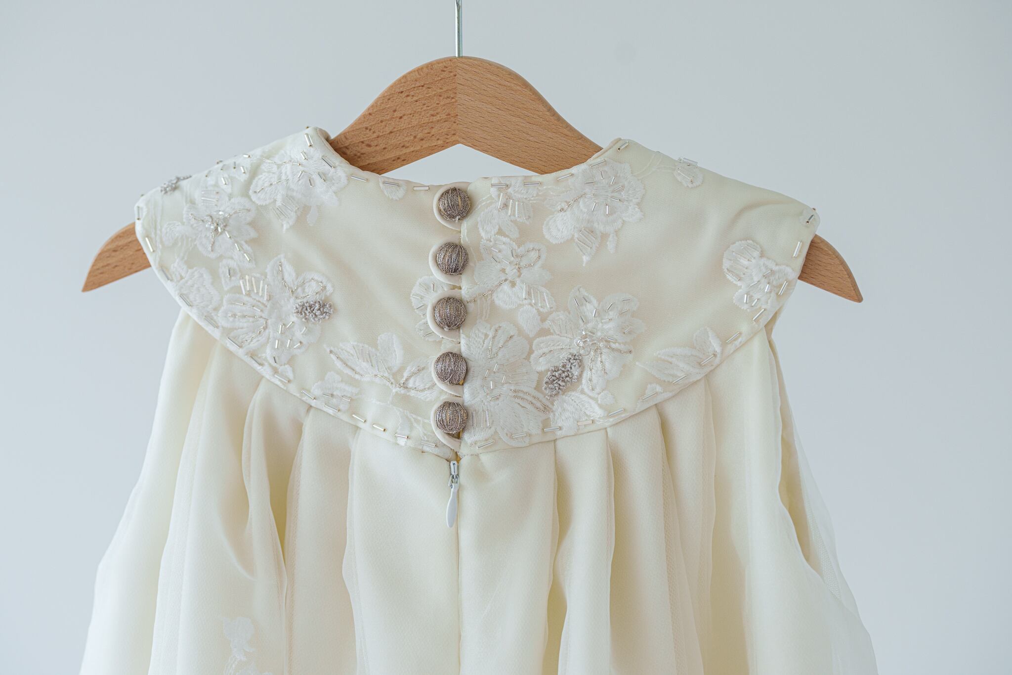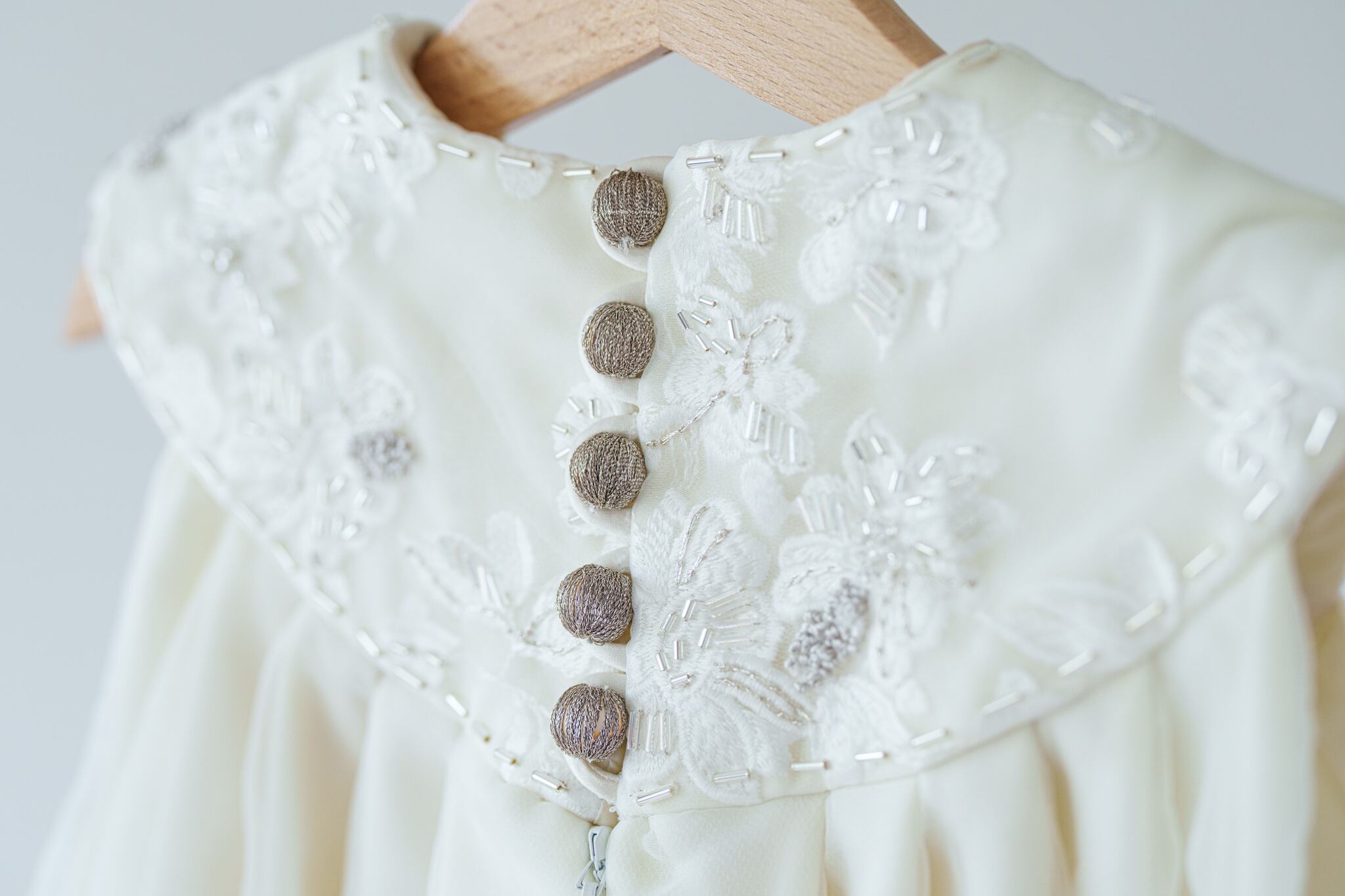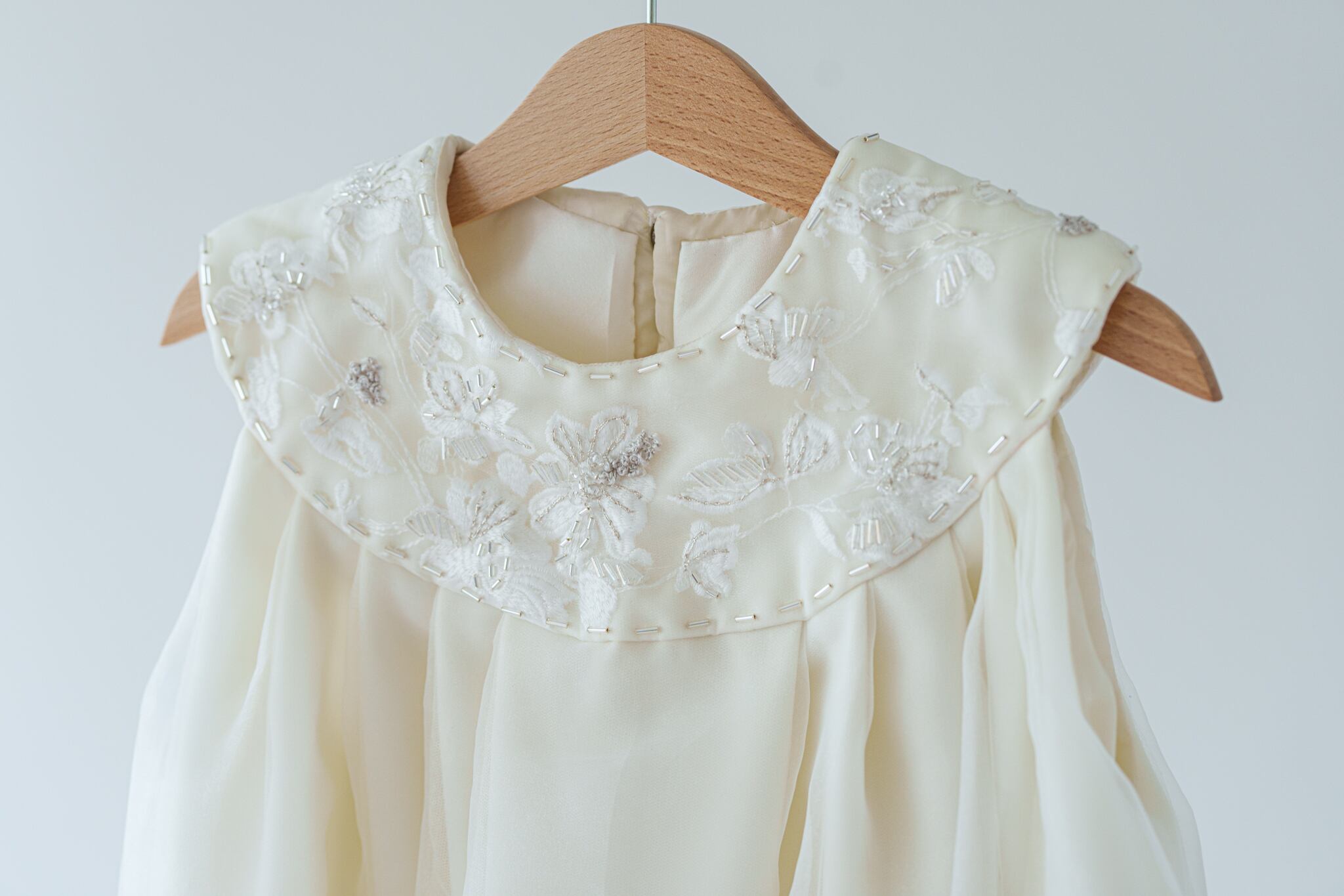 胸元の手刺繍、ステッチもビーズ1つから、丁寧に縫い上げています。